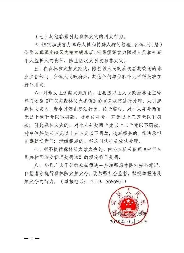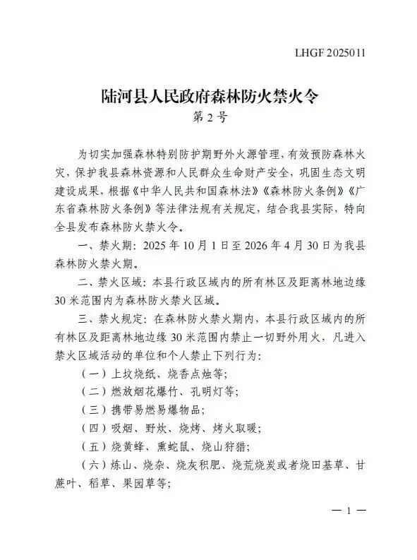 当前正值森林防火关键期,森林防火责任重于泰山,请广大村民朋友务必严格遵守《陆河县人民政府森林防火禁火令(第2号)》及各项森林防火规定,时刻绷紧森林防火“安全弦”,切实增强森林防火意识,共同守护森林资源,维护生态安全。下来,我镇将继续加大巡查力度,综合运用全天候巡逻、无人机监控等措施,对一切违规用火行为“零容忍”,坚决做到发现一起、查处一起。