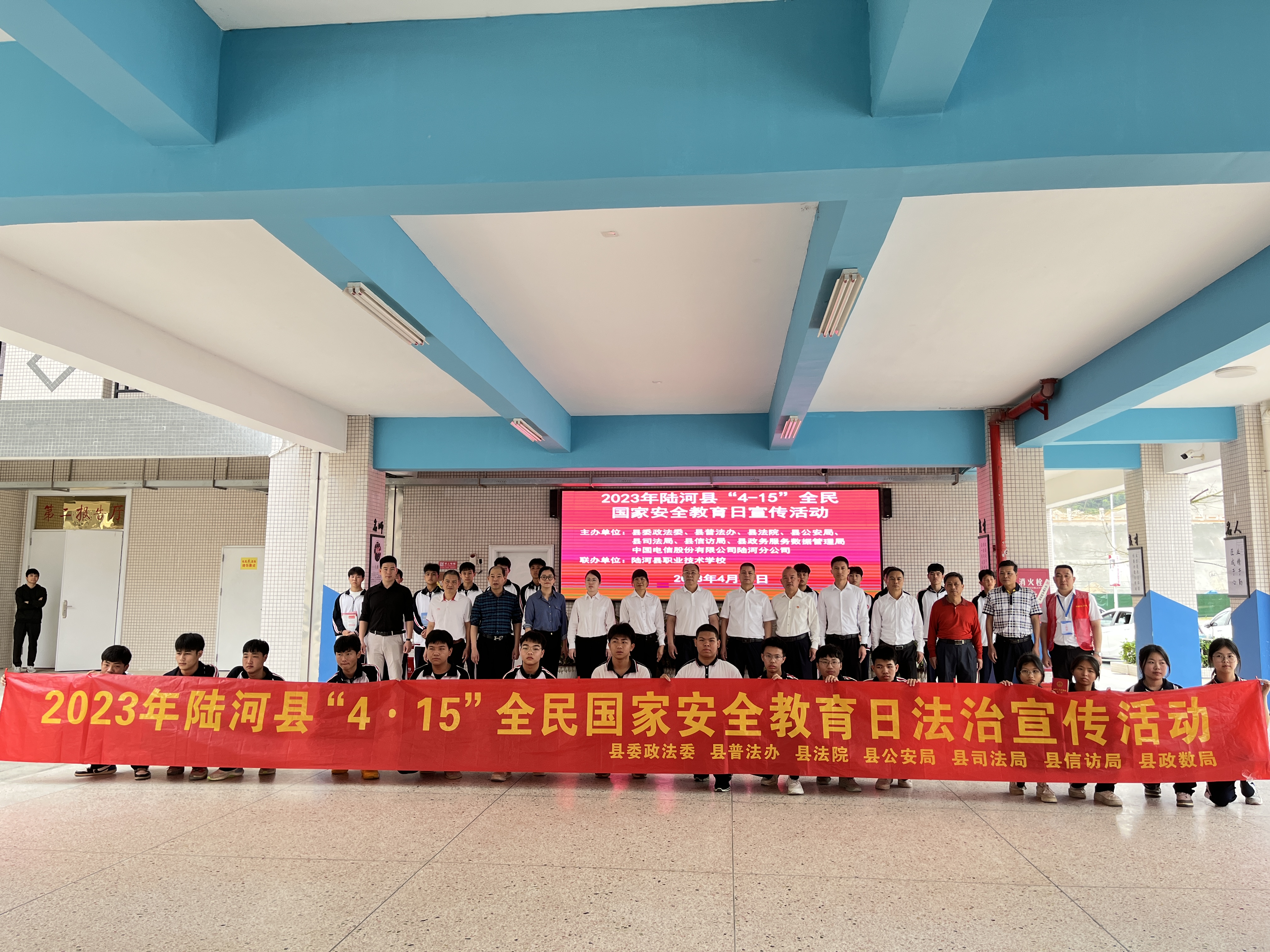 为认真贯彻落实总体国家安全观,推进青少年法治宣传教育,2023年4月14日上午,县委政法委、县法院、县公安局、县司法局、县信访局、县政数局等单位联合走进县职业技术学校,开展“4·15”全民国家安全教育日法治宣传活动。