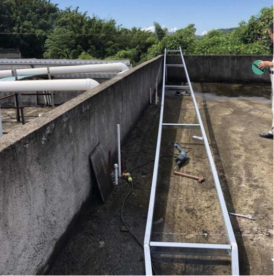 1.树脂瓦底架。事故现场摆放的树脂瓦底架为镀锌角钢支架,底架长度为12.8米,宽度为0.57米。(图1)