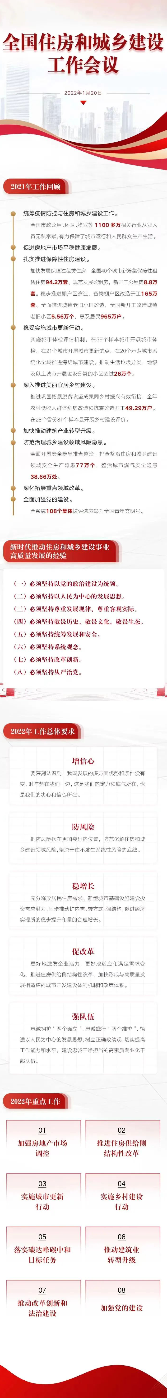 1月20日,全国住房和城乡建设工作会议在北京以视频形式召开。会议深入学习贯彻习近平新时代中国特色社会主义思想,全面贯彻落实党的十九大和十九届历次全会精神、中央经济工作会议精神,总结2021年工作,分析形势和问题,研究部署2022年工作。住房和城乡建设部党组书记、部长王蒙徽作工作报告。