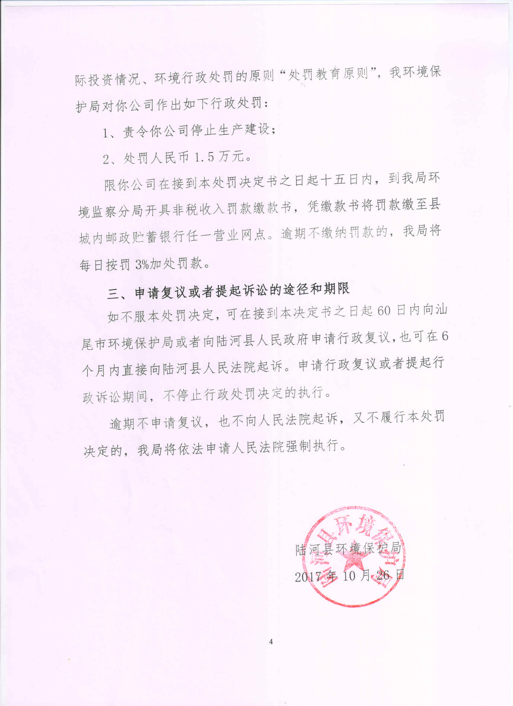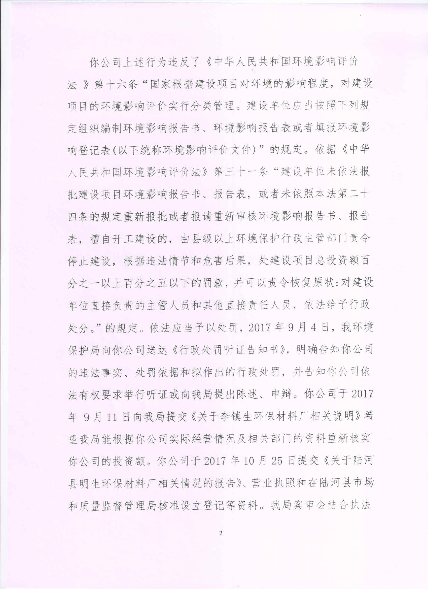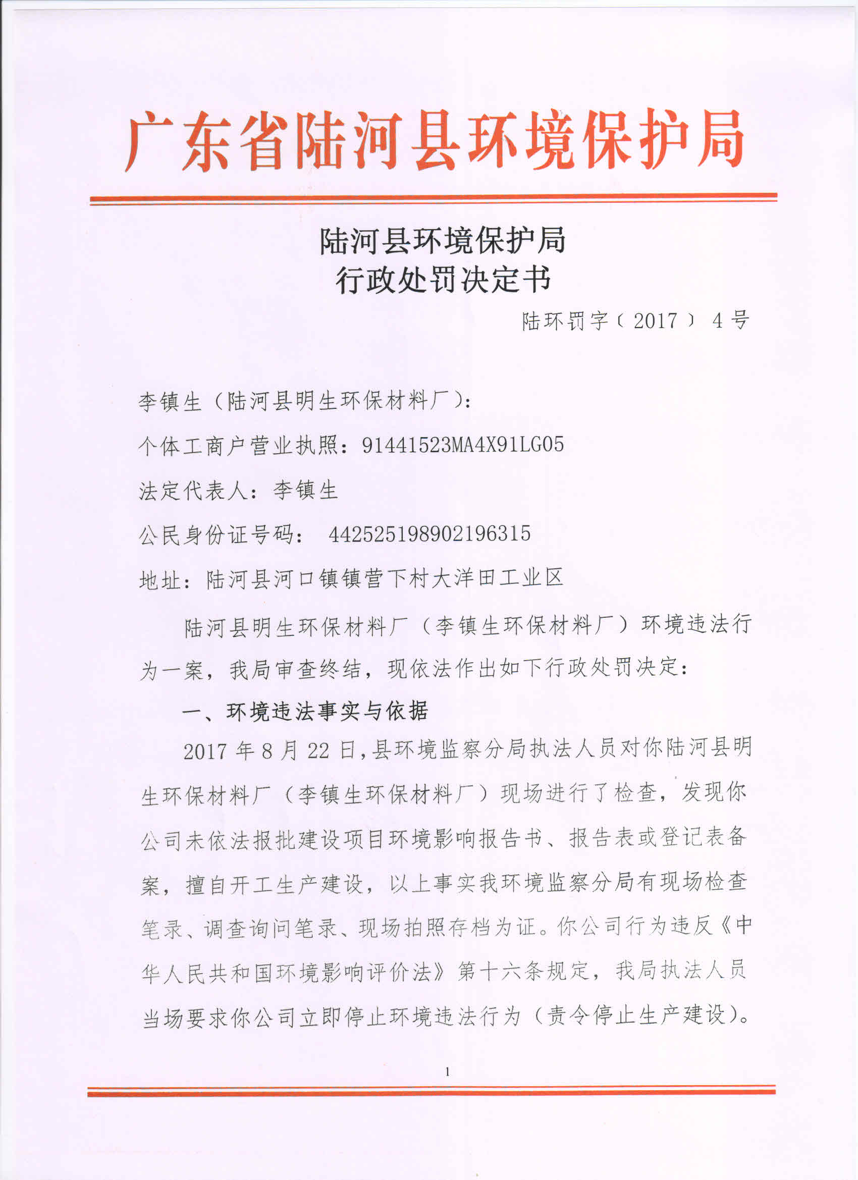 行政处罚决定书(陆河县明生环保材料厂)