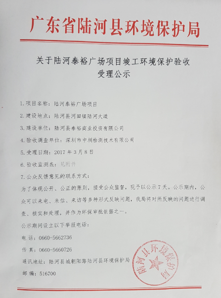 关于陆河泰裕广场项目竣工环境保护验收受理公示
