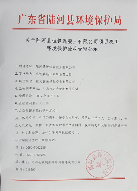 关于陆河县恒锋混凝土有限公司项目竣工环境保护验收受理公示