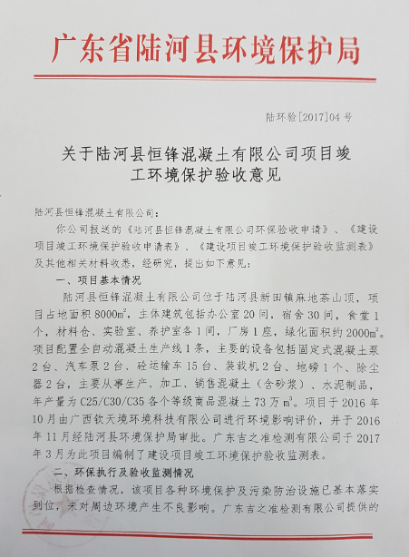 关于陆河县恒锋混凝土有限公司项目竣工环境保护验收意见
