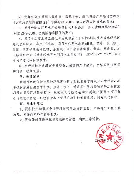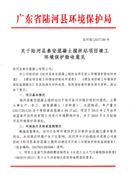 关于陆河县泰安混凝土搅拌站项目竣工环境保护验收意见