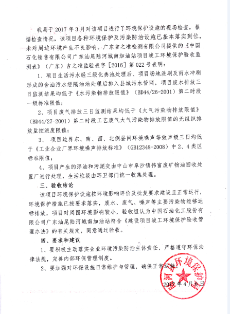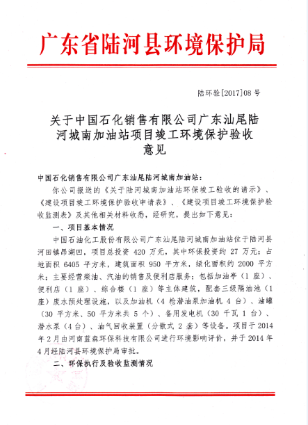 关于中国石化销售有限公司广东汕尾陆河城南加油站项目竣工环境保护验收意见