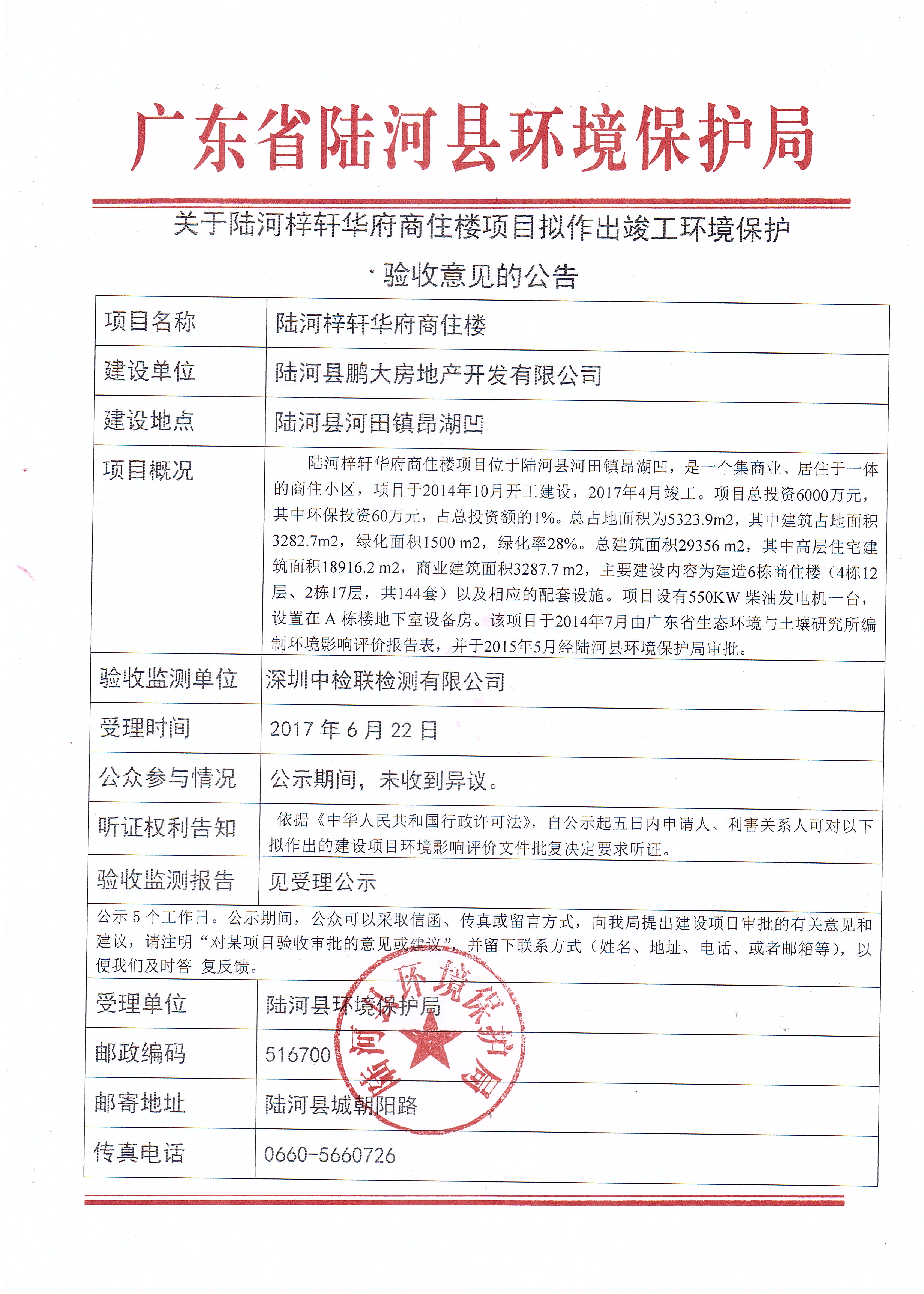 关于陆河梓轩华府商住楼项目拟作出竣工环境保护验收意见的公告