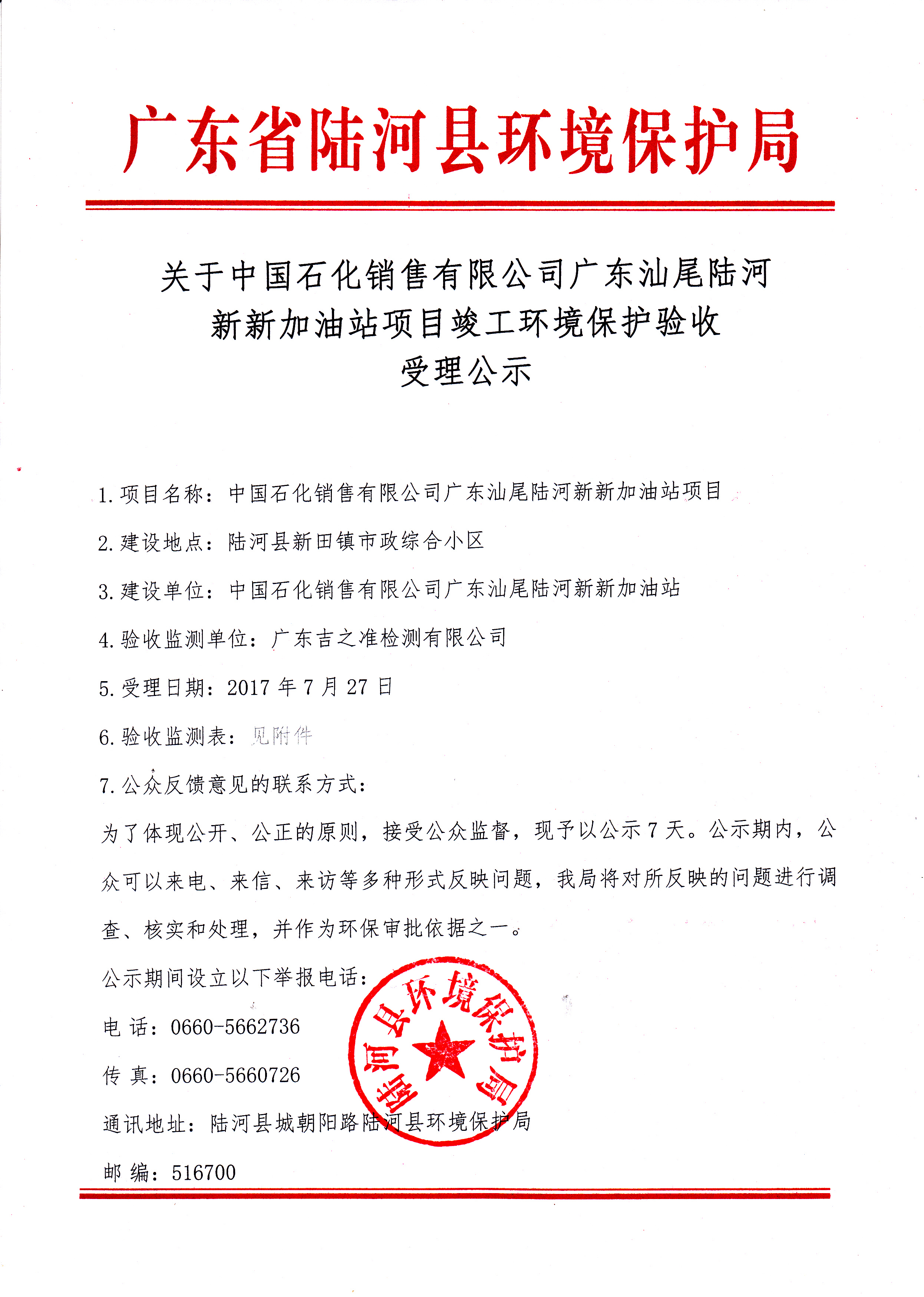 关于中国石化销售有限公司广东汕尾陆河新新加油站项目竣工环境保护验收受理公示
