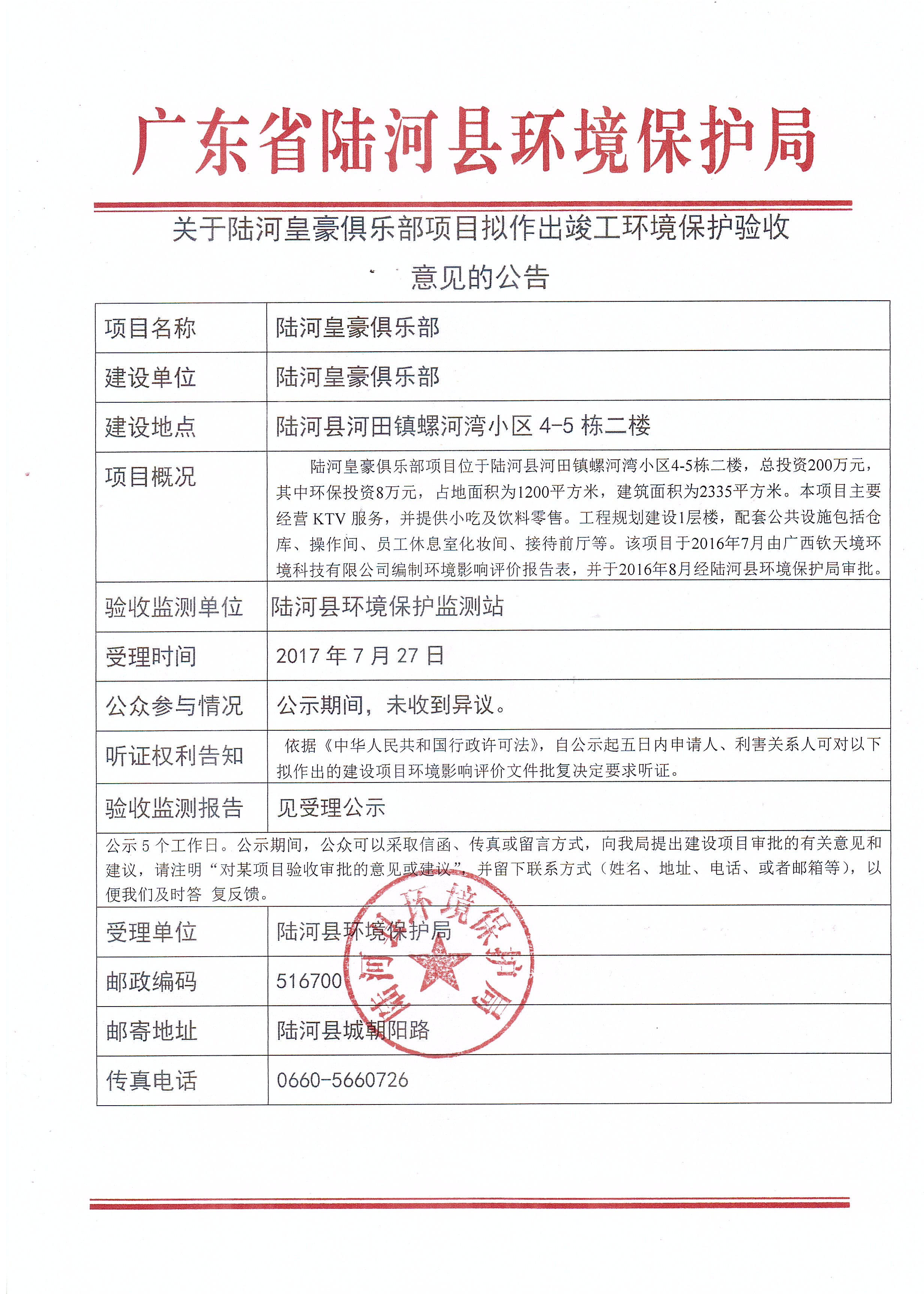 关于陆河皇豪俱乐部项目拟作出竣工环境保护验收意见的公告