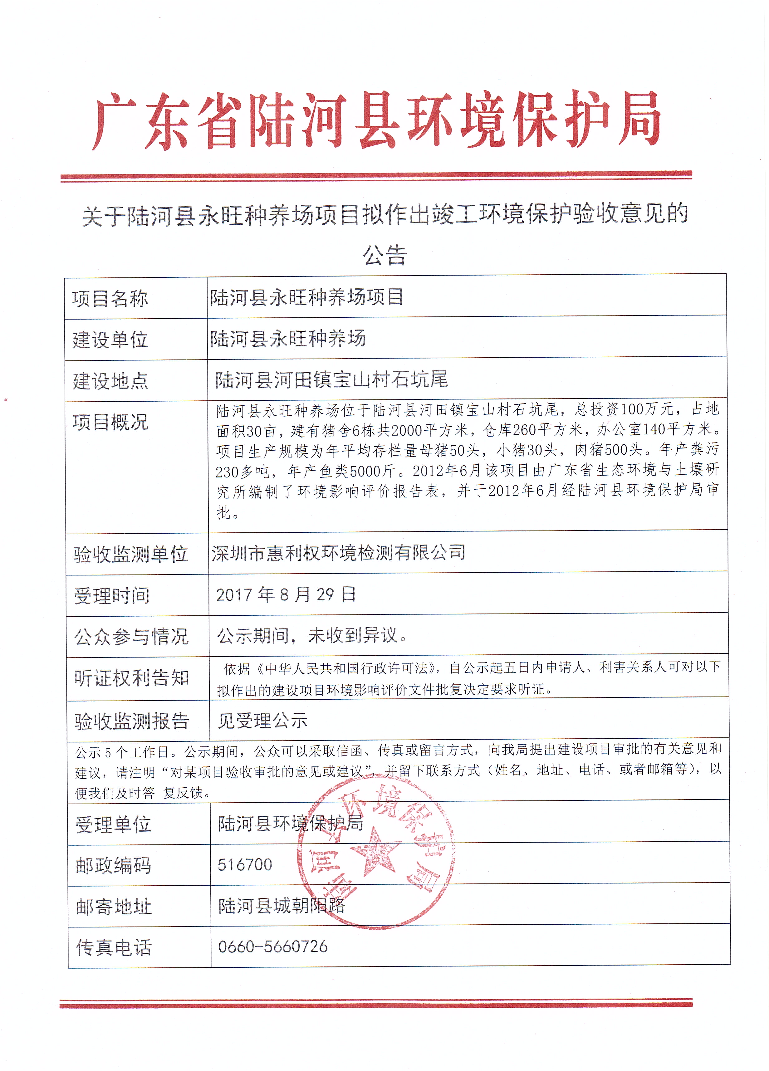 关于陆河县永旺种养场项目拟作出竣工环境保护验收意见的公告