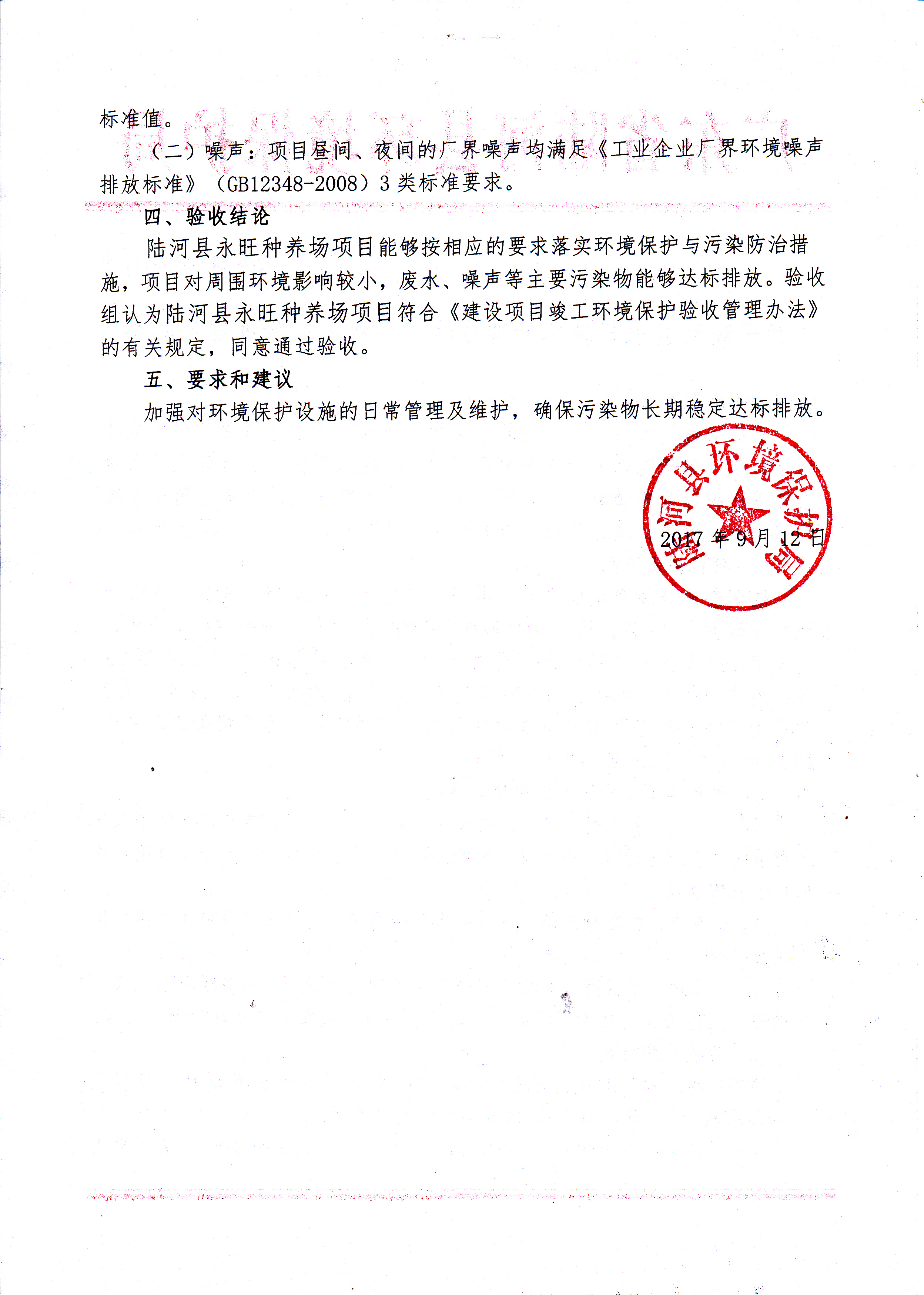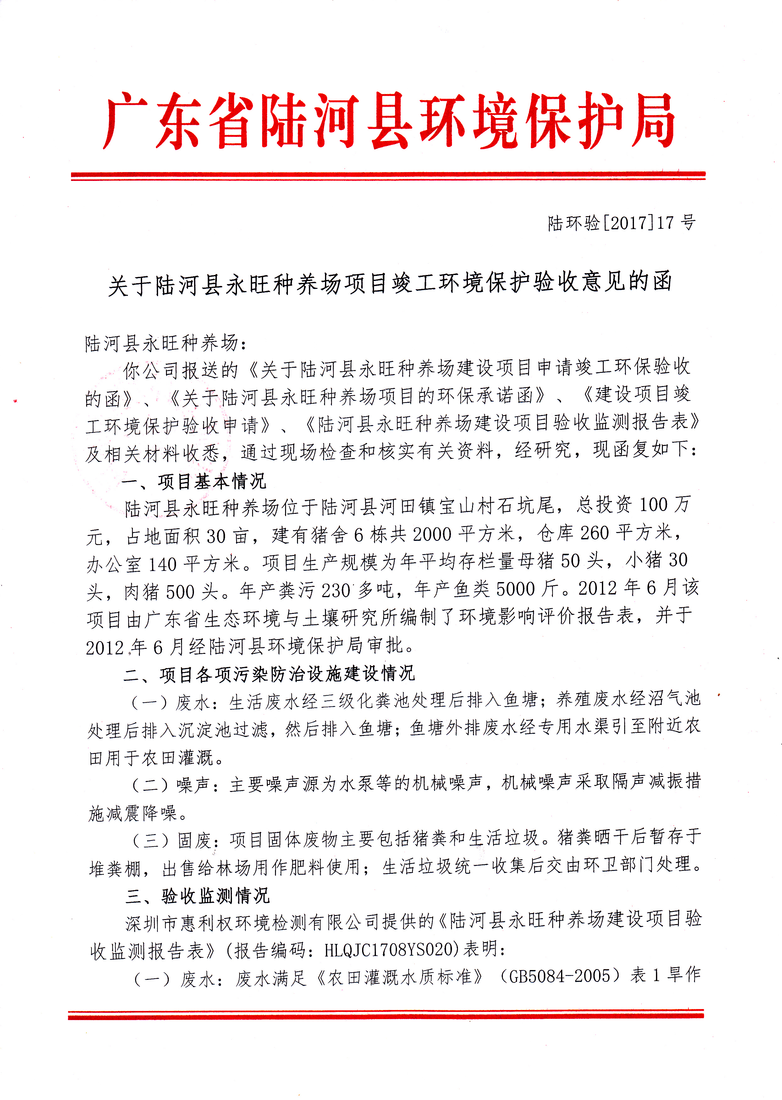 关于陆河县永旺种养场项目竣工环境保护验收意见的函