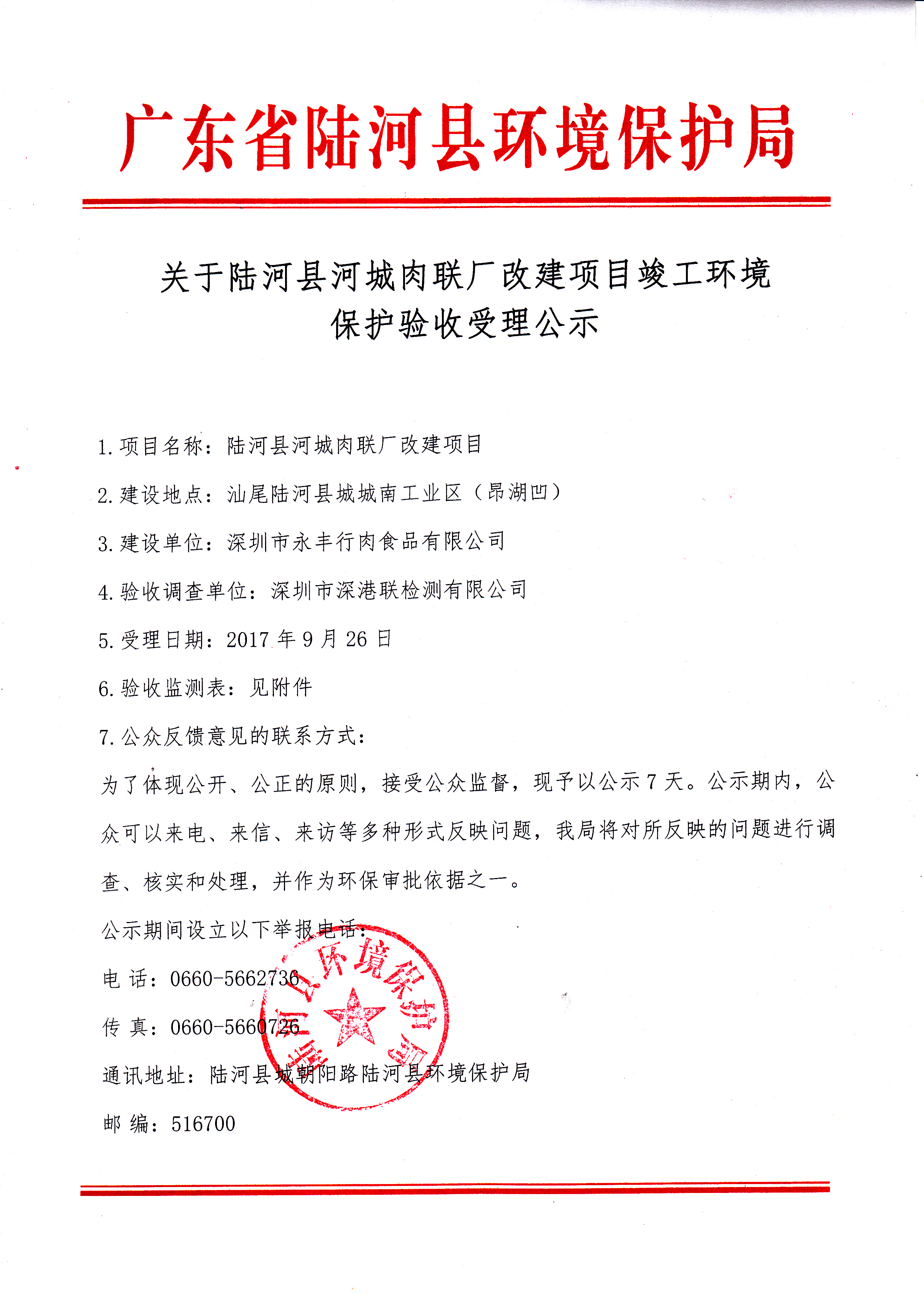 关于陆河县河城肉联厂改建项目竣工环境保护验收受理公示
