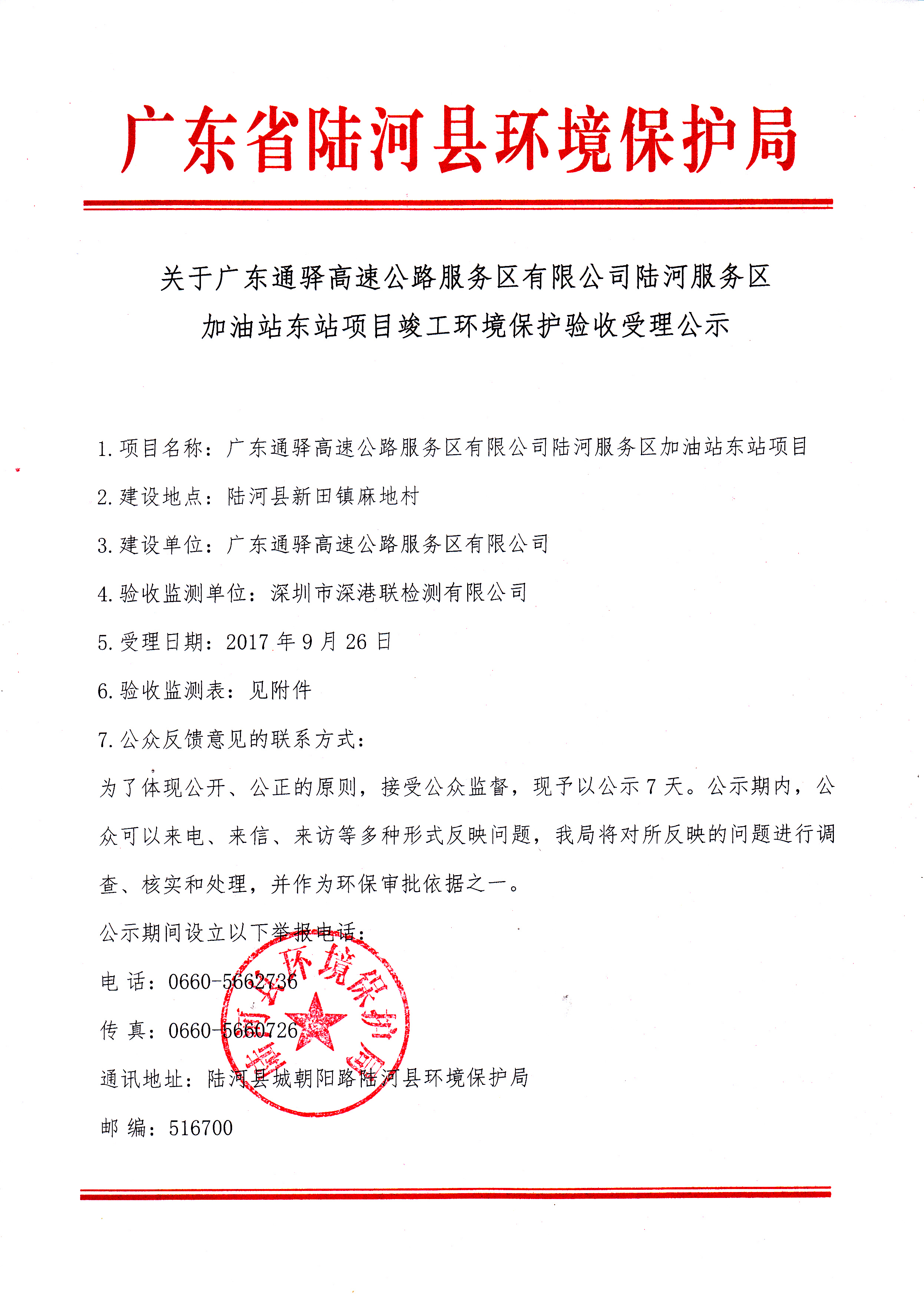 关于广东通驿高速公路服务区有限公司陆河服务区加油站东站项目竣工环境保护验收受理公示