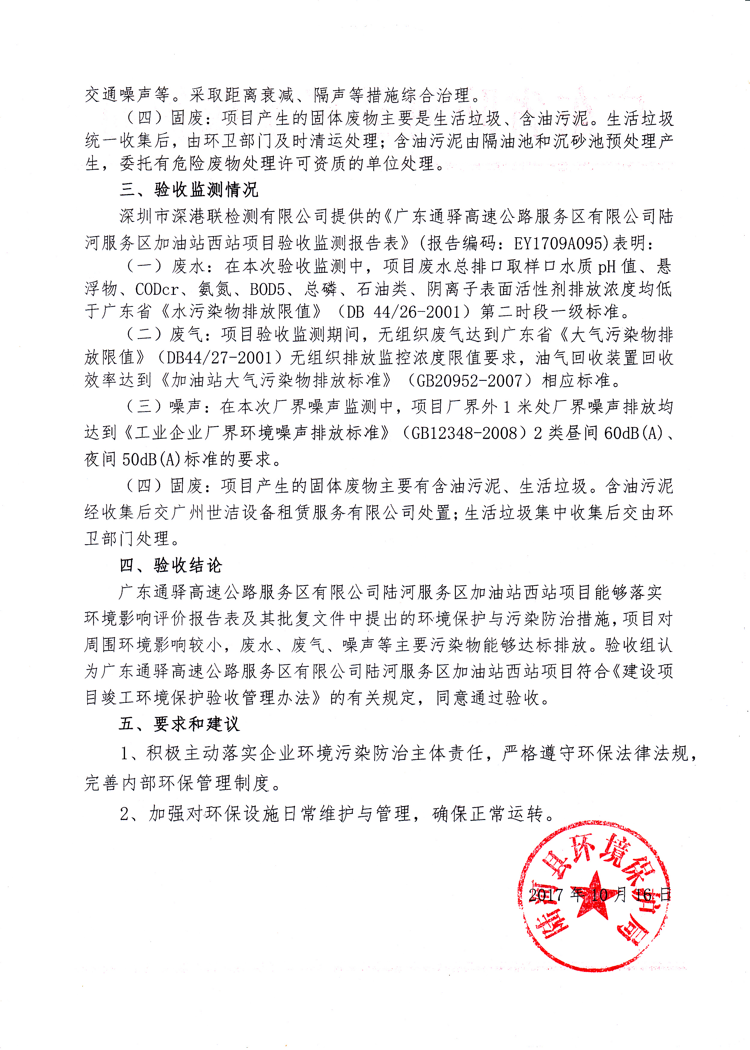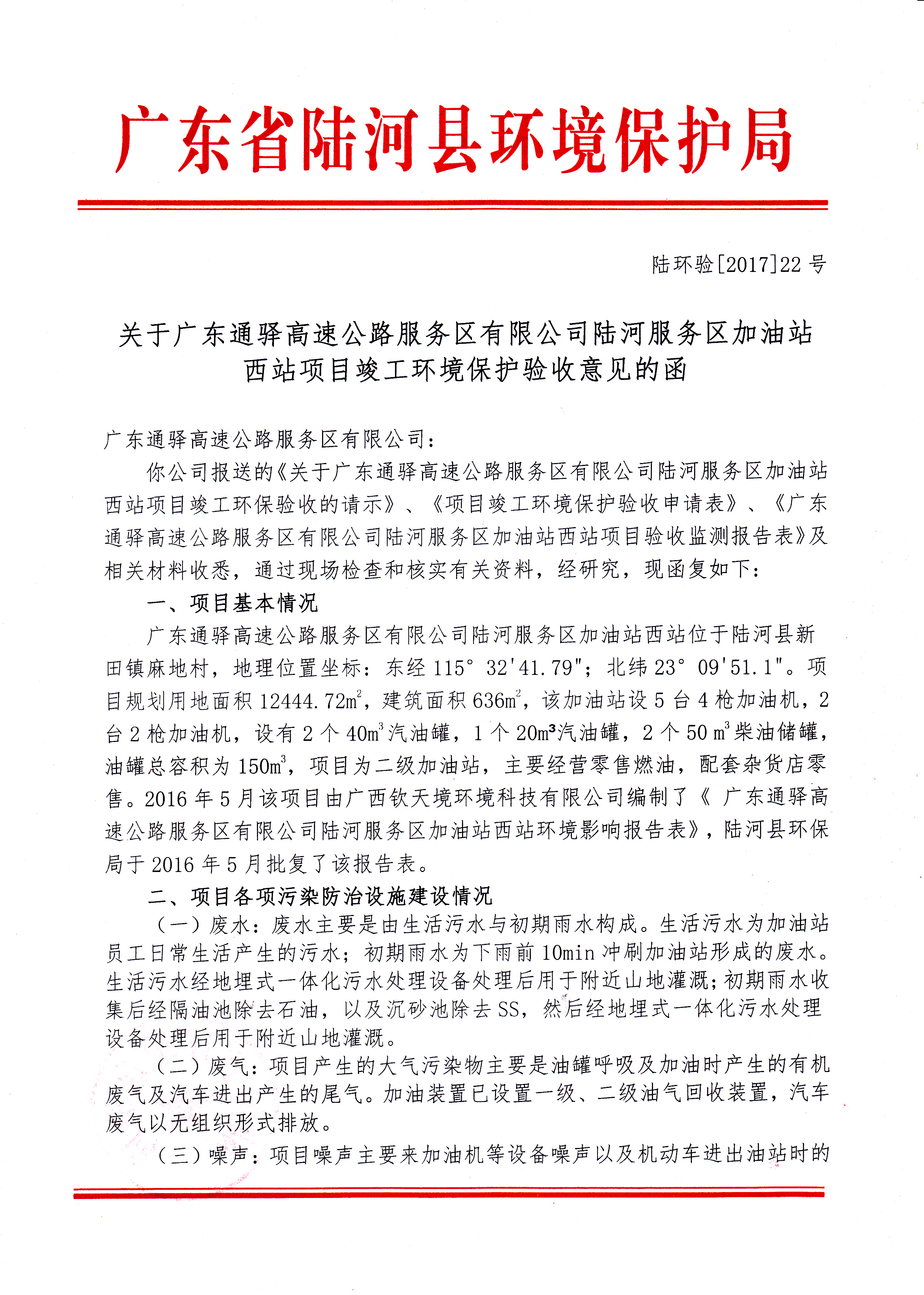 关于广东通驿高速公路服务区有限公司陆河服务区加油站西站项目竣工环境保护验收意见的函
