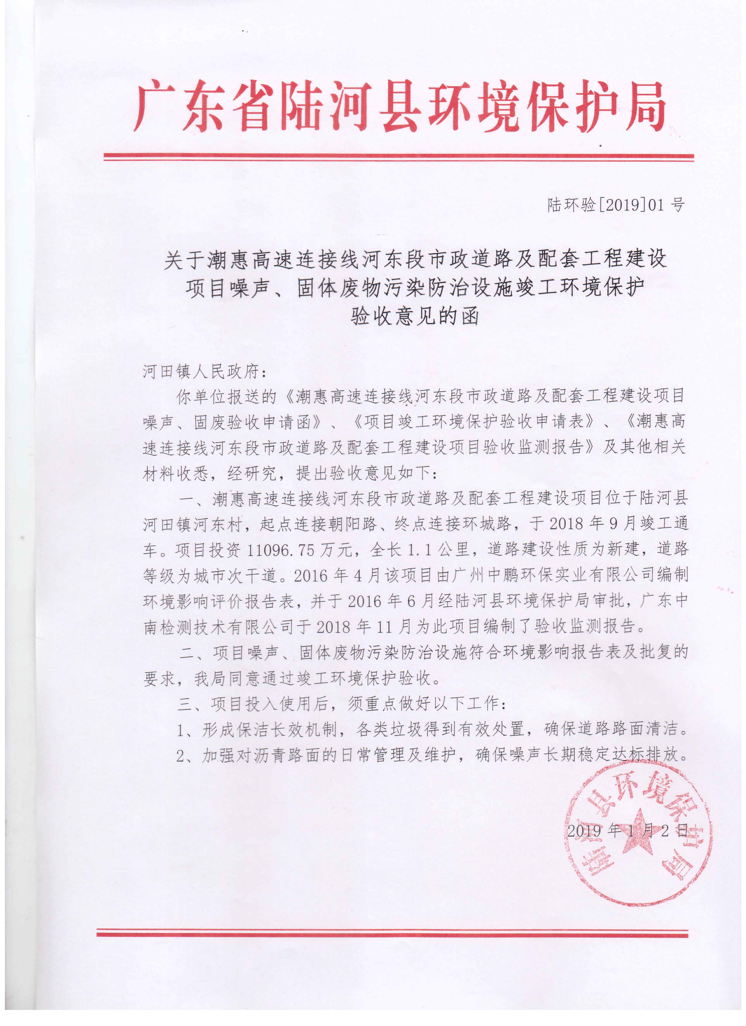 关于潮惠高速连接线河东段市政道路及配套工程建设项目噪声、固体废物污染防治设施竣工环境保护验收意见的函