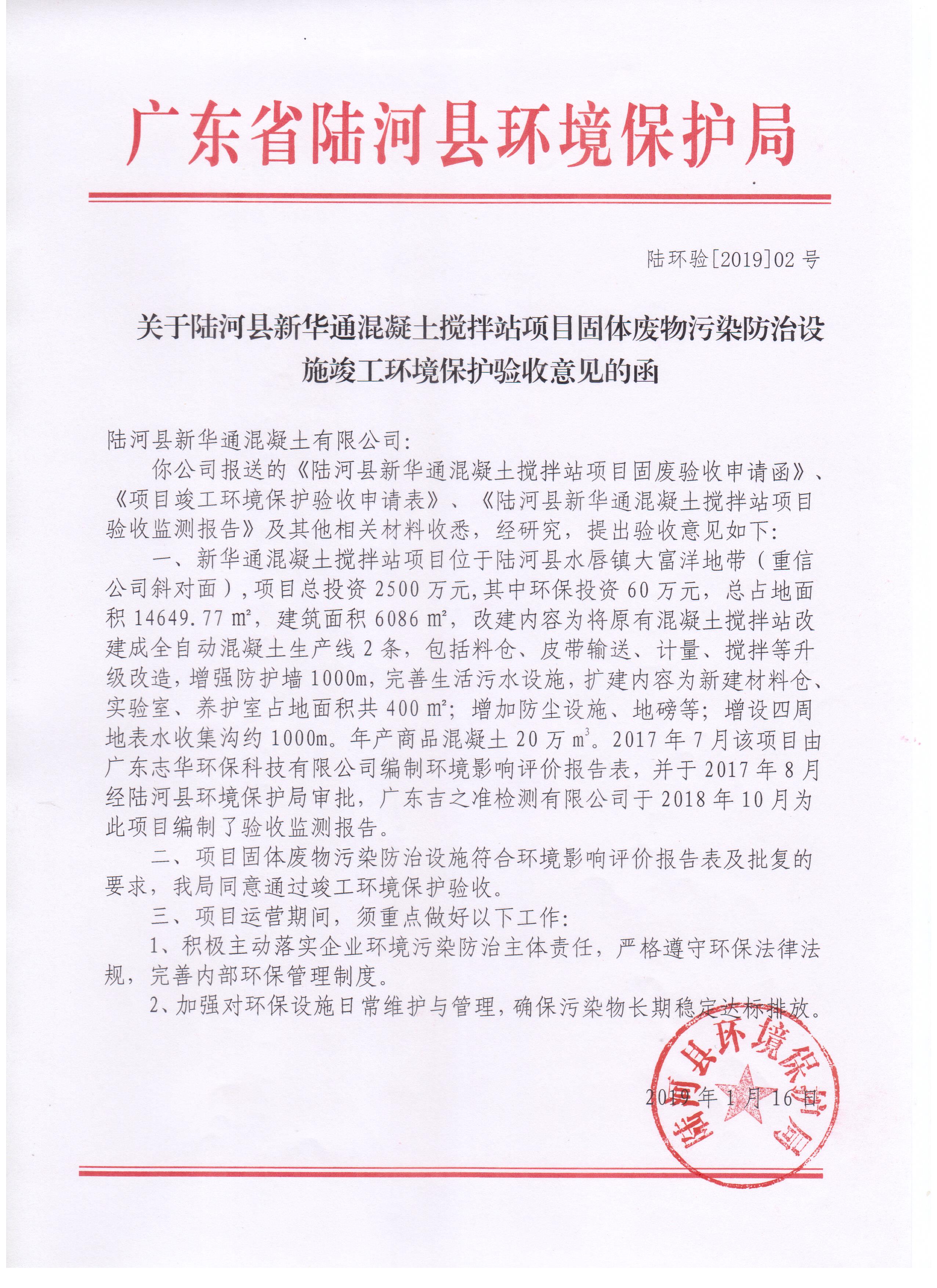 关于陆河县新华通混凝土搅拌站项目固体废物污染防治设施竣工环境保护验收意见的函