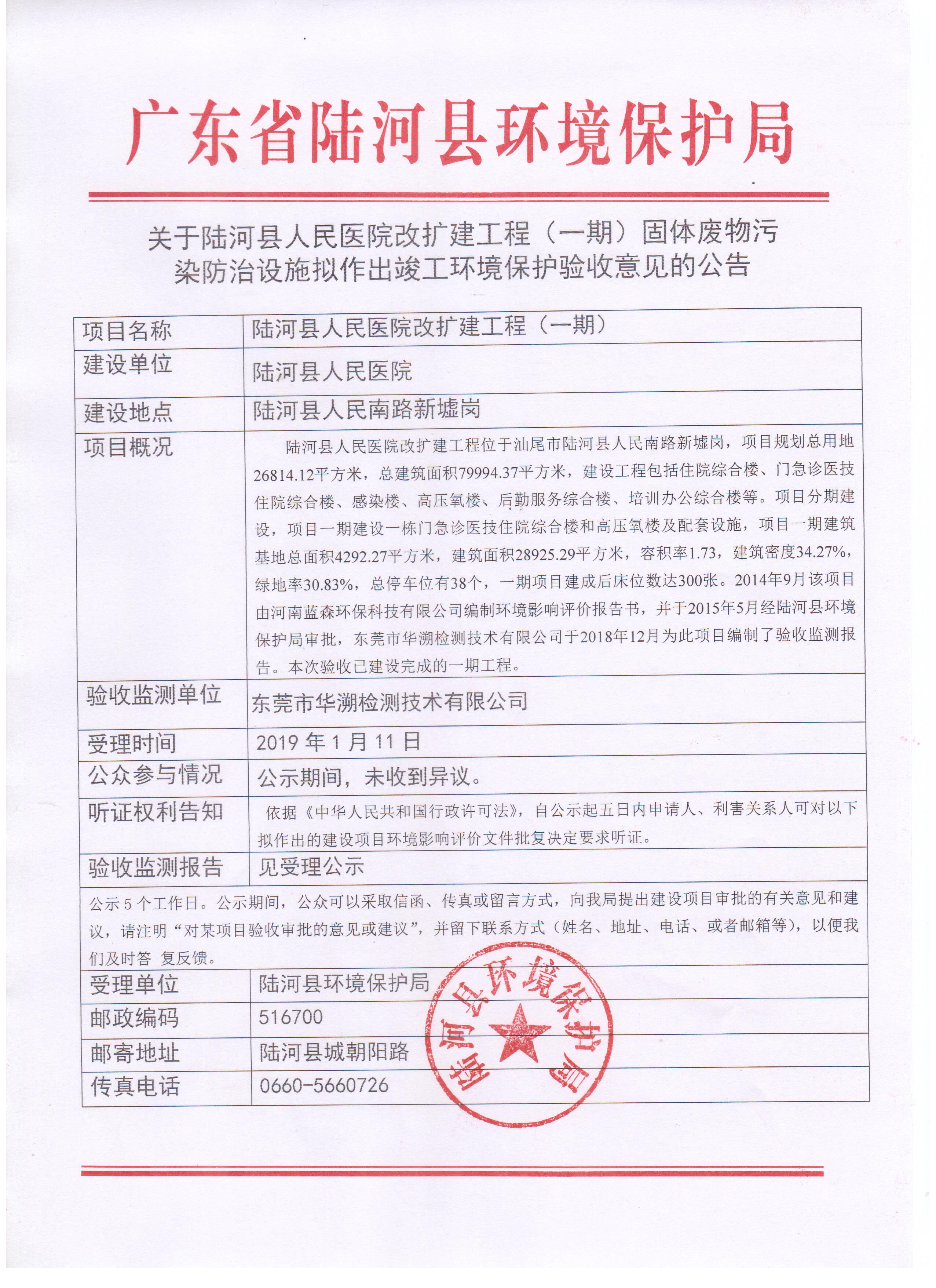 关于陆河县人民医院改扩建工程(一期)固体废物污染防治设施拟作出竣工环境保护验收意见的公告