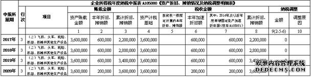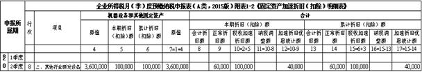 注3:会计采取正常折旧方法,税收加速折旧的固定资产,按照会计账册反映的折旧额填写第17列、第19列,第17列-第18列的差额,反映本期享受税收加速折旧优惠政策导致应纳税所得额减少的金额,在年度申报表附表A105080《资产折旧、摊销情况及纳税调整明细表》进行纳税调整。例一中A企业按照第18列的总计数,填报年度申报表附表A105080《资产折旧、摊销情况及纳税调整明细表》第3行“(二)飞机、火车、轮船、机器、机械和其他生产设备”的“税收金额”中第6列“本年加速折旧额”与第7列“其中:2014年及以后年度新增固定资产加速折旧额”,进行纳税调整。