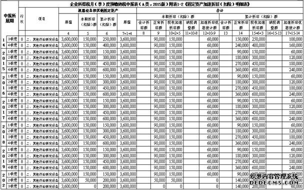 注4:当税收加速折旧额小于按会计折旧额时,不再填写本表的当期数,年度内保留累计数。例三中C企业固定资产税收折旧于2014年3季度预缴申报时一次性税前扣除,2014年4季度预缴申报时,固定资产税收加速折旧额为0,因此2014年4季度的当期数为0,累计数保留至2014年4季度。