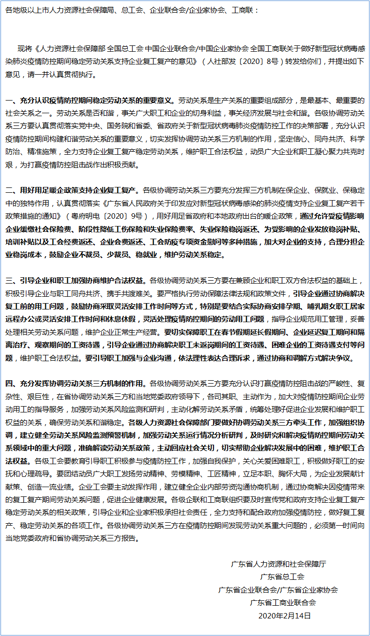 稳定劳动关系支持企业复工复产的意见》的通知