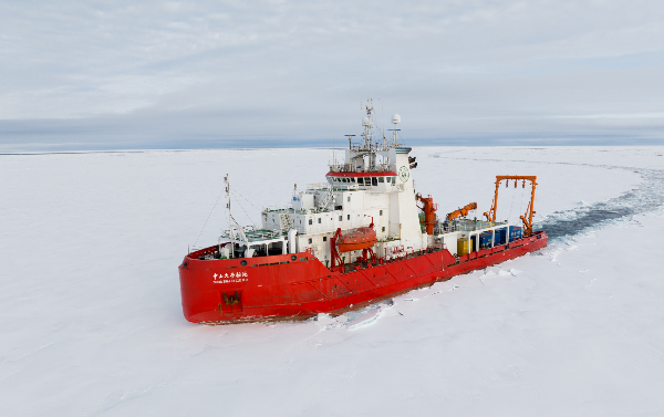 “中山大学极地”号破冰科考船在北冰洋执行科学考察任务。广东省教育厅供图