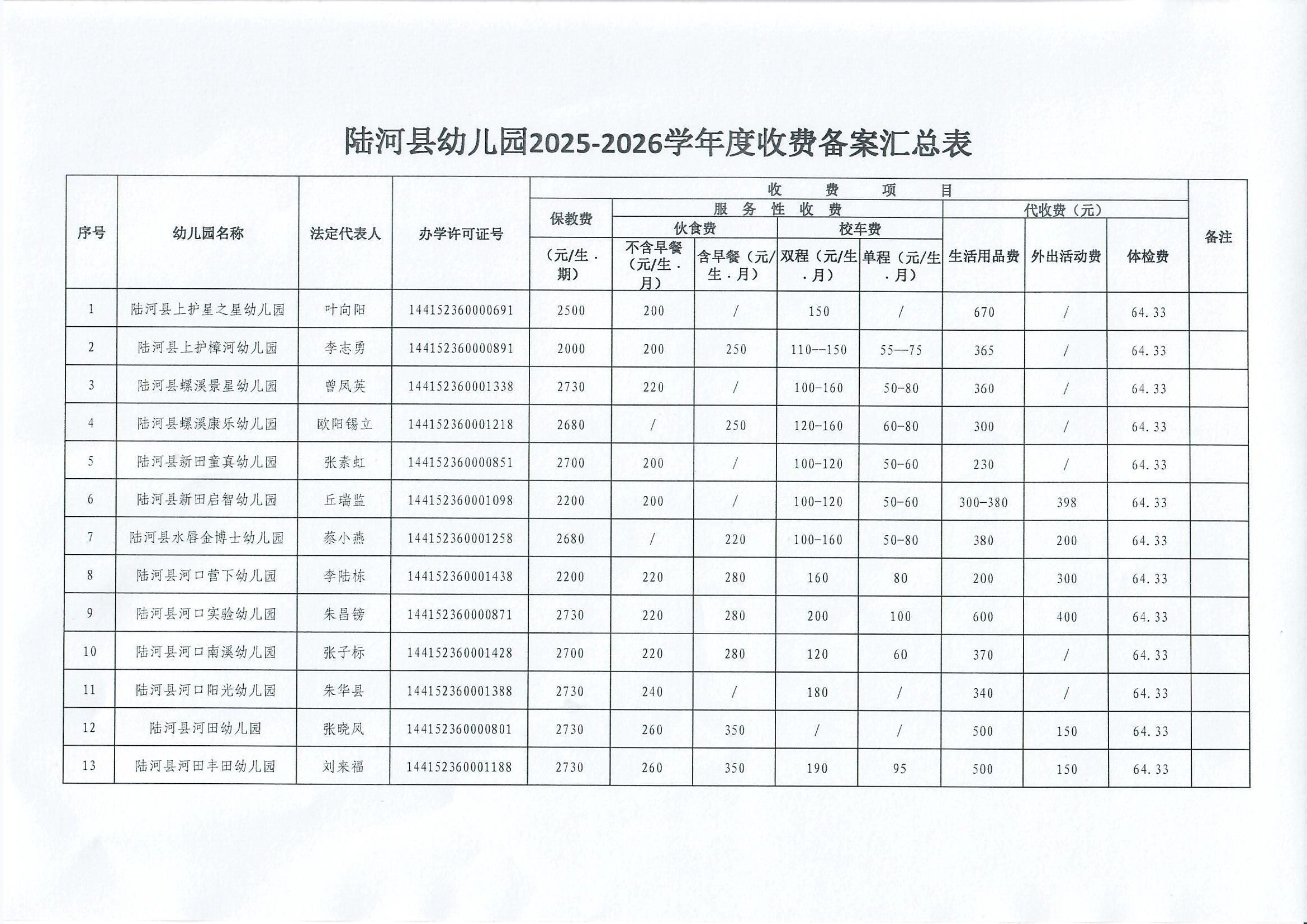 陆河县幼儿园2025-2026学年度收费备案汇总表