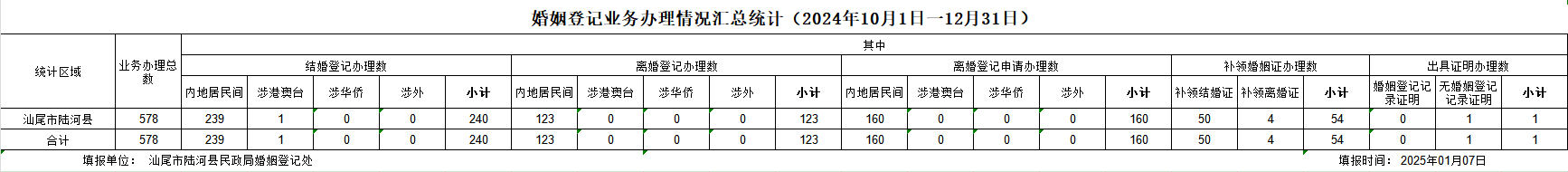陆河县2024年10-12月婚姻登记业务办理汇总统计
