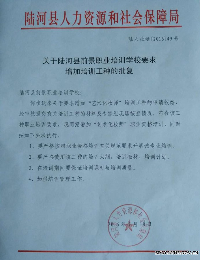 关于陆河县前景职业培训学校要求增加培训工种的批复