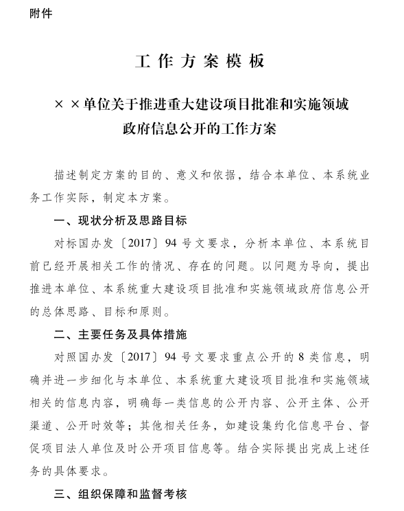 为认真贯彻落实《国务院办公厅关于推进重大建设项目批准和实施领域政府信息公开的意见》(国办发〔2017〕94号),加快推进我省重大建设项目政府信息公开工作,经省人民政府同意,现将有关工作要求通知如下: 一、明确范围,稳步推进“应公开尽公开” 各地、各有关部门要根据本地实际和行业特点,明确提出公开工作目标和具体措施,确保重大建设项目批准和实施领域政府信息公开扎实推进。省发展改革、经济和信息化、国土资源、环保、住房城乡建设、交通运输、水利、农业、林业、卫生计生等部门,要进一步细化公开事项、内容、时限、方式、责任主体、监督渠道等内容,并纳入主动公开目录。上述省有关单位要参照本通知下发的模板(见附件),抓紧制定本系统推进重大建设项目批准和实施领域政府信息公开的具体工作方案,并于本通知下发之日起两个月内报省政府办公厅备案,同时将工作方案在本单位门户网站上公开,接受社会监督。 各地、各有关部门要把重大建设项目批准和实施领域政府信息公开作为全面推进政务公开工作的重要内容,建立健全协调机制,明确责任分工,拓展公开渠道,以信息公开全面提升项目批准及实施的透明度和效率。要综合利用投资项目在线审批监管平台、公共资源交易平台、征地信息公开平台等专业化平台,以及政府网站和微博、微信等新媒体平台及时公开各类项目信息,切实增强公开实效,并积极回应公众关切。 将重大建设项目批准和实施领域政府信息公开工作纳入政务公开工作绩效考核范围,并定期进行抽查、检查。省政府将对各地、各有关部门工作落实情况进行通报,对未按照相关规定和要求履行公开职责的予以批评,对工作推动有力、取得明显成效的予以表扬。省有关部门每年2月底前要将本领域上一年度工作进展情况报省政府办公厅,并在政府信息公开年度报告中公布。