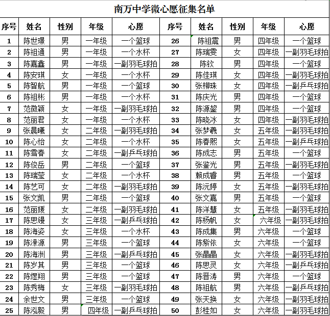 我们诚邀欢迎爱心单位、爱心人士、社会公益组织等社会各界积极参与此次“微心愿”认领活动,帮孩子们圆他们的小小心愿,为他们的成长送上一份小礼物。现将南万中学小朋友的“微心愿”汇总如下: