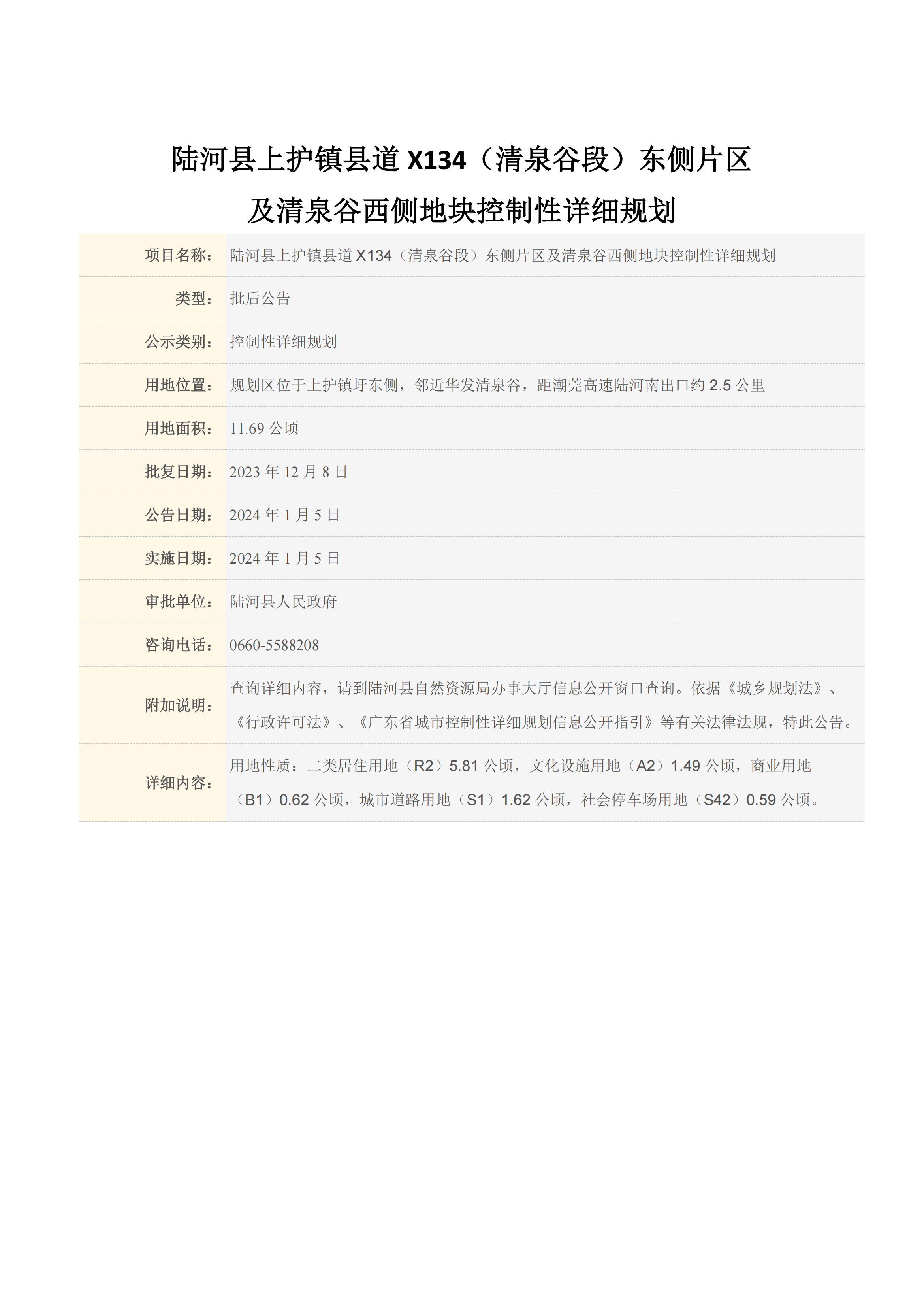 陆河县上护镇县道X134(清泉谷段)东侧片区及清泉谷西侧地块控制性详细规划【批后公告】.pdf