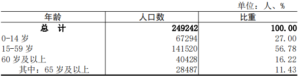 全县常住人口[2]中,0-14岁[3]人口为67294人,占27.00%;15-59岁人口为141520人,占56.78%;60岁及以上人口为40428人,占16.22%,其中65岁及以上人口为28487人,占11.43%。与2010年第六次全国人口普查相比,0-14岁人口的比重下降0.24个百分点,15-59岁人口的比重下降5.02个百分点,60岁及以上人口的比重提高5.35个百分点,65岁及以上人口的比重提高3.47个百分点。