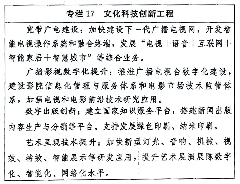 (四)强化文化科技支撑。落实中央财政科技计划管理改革的有关要求,通过优化整合后的科技计划(专项、基金等),支持符合条件的文化科技项目。运用云计算、人工智能、物联网等科技成果,催生新型文化业态。加强虚拟现实技术的研发与运用。推动“三网融合”。制定文化产业领域技术标准,深入推进国家文化科技创新工程。依托国家级文化和科技融合示范基地,加强文化科技企业创新能力建设,提高文化核心技术装备制造水平。加强文化资源的数字化采集、保存和应用。