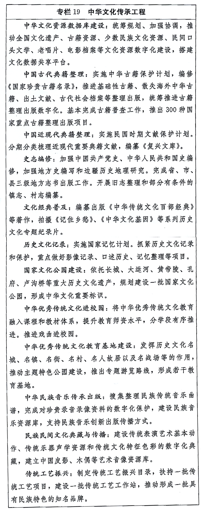 (一)加强中华优秀传统文化研究挖掘和创新发展。系统梳理中华文化的历史渊源、发展脉络、时代影响,阐明中华文化的独特创造、价值理念。厘清中华优秀传统文化的内涵,改造陈旧的表现形式,赋予新的时代内涵和现代表达形式。加强中华优秀传统文化典籍整理和出版,推进文化典籍资源数字化。推动文博单位开发相关文化创意产品。