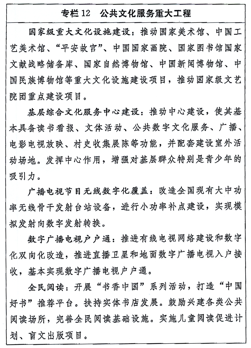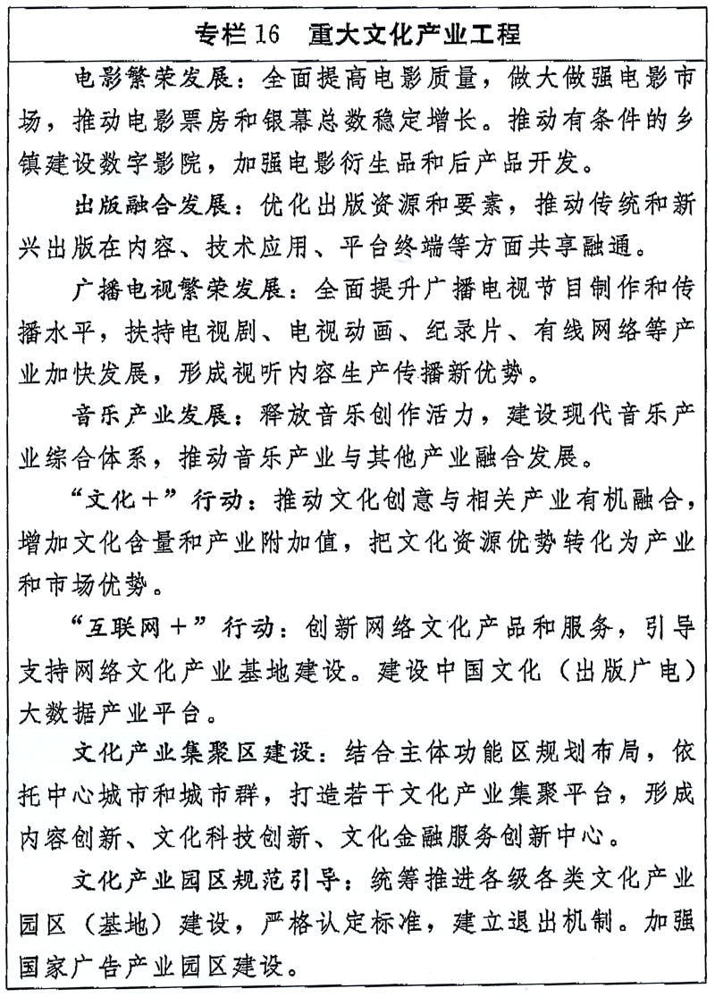《国家“十三五”时期文化发展改革规划纲要》主要内容如下。