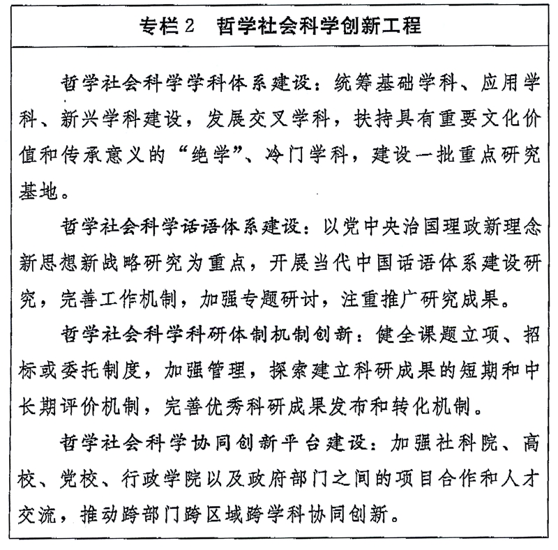 (二)繁荣发展哲学社会科学。坚持马克思主义立场观点方法,按照立足中国、借鉴国外,挖掘历史、把握当代,关怀人类、面向未来的思路,着力构建中国特色哲学社会科学。建立健全哲学社会科学管理体制,加强哲学社会科学创新平台、研究基地、传播中心建设。加强话语体系建设,注重以我为主设置议题,积极开展中国哲学社会科学国际学术研讨活动。举办当代中国马克思主义论坛系列理论研讨会。加强对各类讲座论坛、社科机构的引导和管理。发挥国家哲学社会科学基金示范引导作用,强化考核评价工作。充分发挥中国特色新型智库作用,形成定位明晰、特色鲜明、规模适度、布局合理、能进能出的中国特色新型智库体系。扶持哲学社会科学优秀著作出版。编写哲学社会科学普及读本。