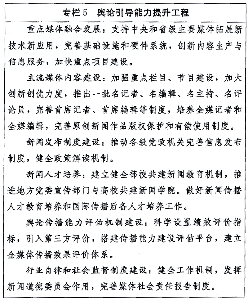 (一)做强做大主流舆论。适应分众化、差异化传播趋势,加快构建主流舆论矩阵。加强党报党刊、通讯社、电台电视台等重点新闻媒体建设,提高宣传报道专业化水平。加强和改进正面宣传,做亮党中央治国理政新理念新思想新战略重大主题宣传,做活经济宣传,做好热点引导。综合运用微博、微信、移动新闻客户端等传播方式,拓展主流舆论传播空间。建立和完善民意调查等制度。做好重大突发事件新闻报道和权威信息发布,把握舆论引导的时度效。加强和改进舆论监督,发挥舆论监督建设性作用。