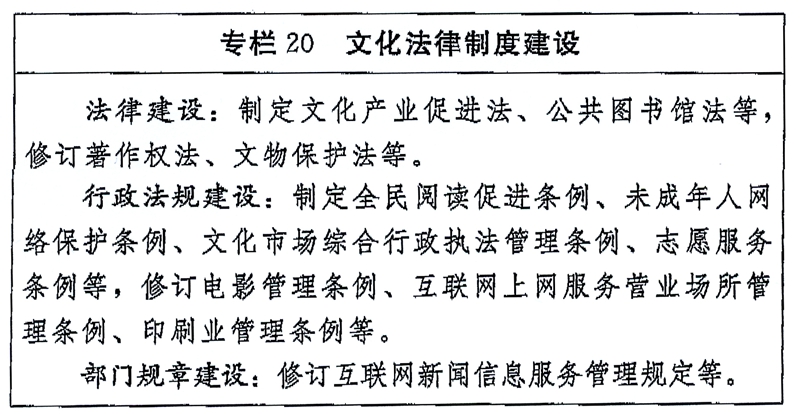 (二)完善文化管理体制。加快文化立法进程,强化文化法治保障,全面推进依法行政。抓好公共文化服务保障法、网络安全法、电影产业促进法等法律的实施。深化文化行政管理体制改革,推动政府职能转变,赋予文化企事业单位更多的法人自主权。健全互联网管理领导体制,加强互联网文化管理法规制度建设,完善有关管理工作联动机制。健全国有文化资产管理体制机制。深化文化市场综合行政执法改革,理顺执法机构与有关行政管理部门之间的关系,全面落实行政执法责任制。推进文化类社会组织和行业自律建设,深化文联、作协、记协改革。
