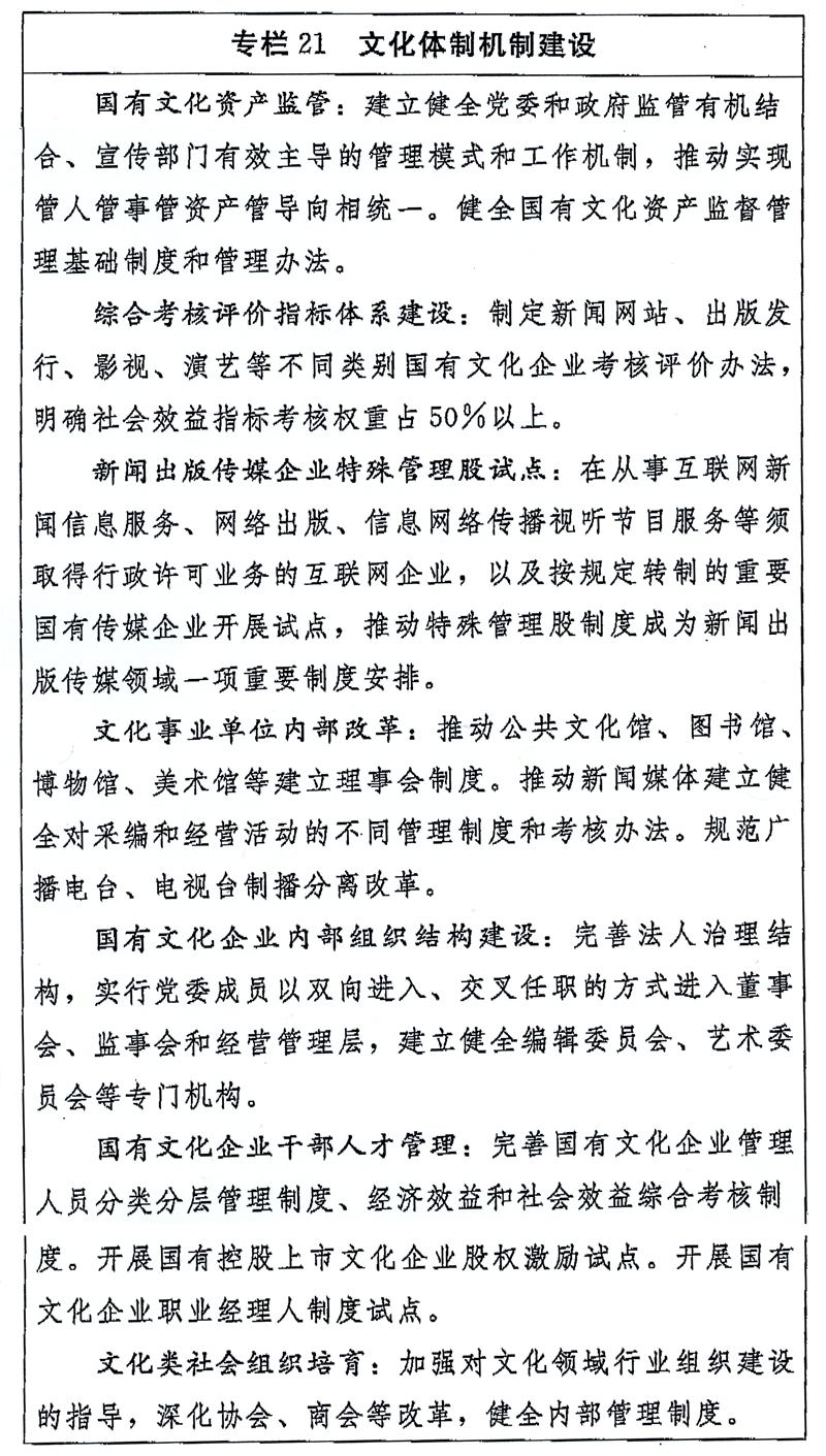 (三)深化文化事业单位改革。分类推进文化事业单位改革,进一步明确不同单位的功能定位。深化人事、收入分配、社会保障、经费保障等制度改革,加强绩效评估考核。推动公共文化馆、图书馆、博物馆、美术馆等建立事业单位法人治理结构。加大对党报党刊、通讯社、电台电视台、时政类报刊社、公益性出版社等主流媒体扶持力度,加强内部管理,严格实行采编与经营分开,规范经营活动。在坚持出版权、播出权特许经营前提下,允许制作和出版、制作和播出分开。