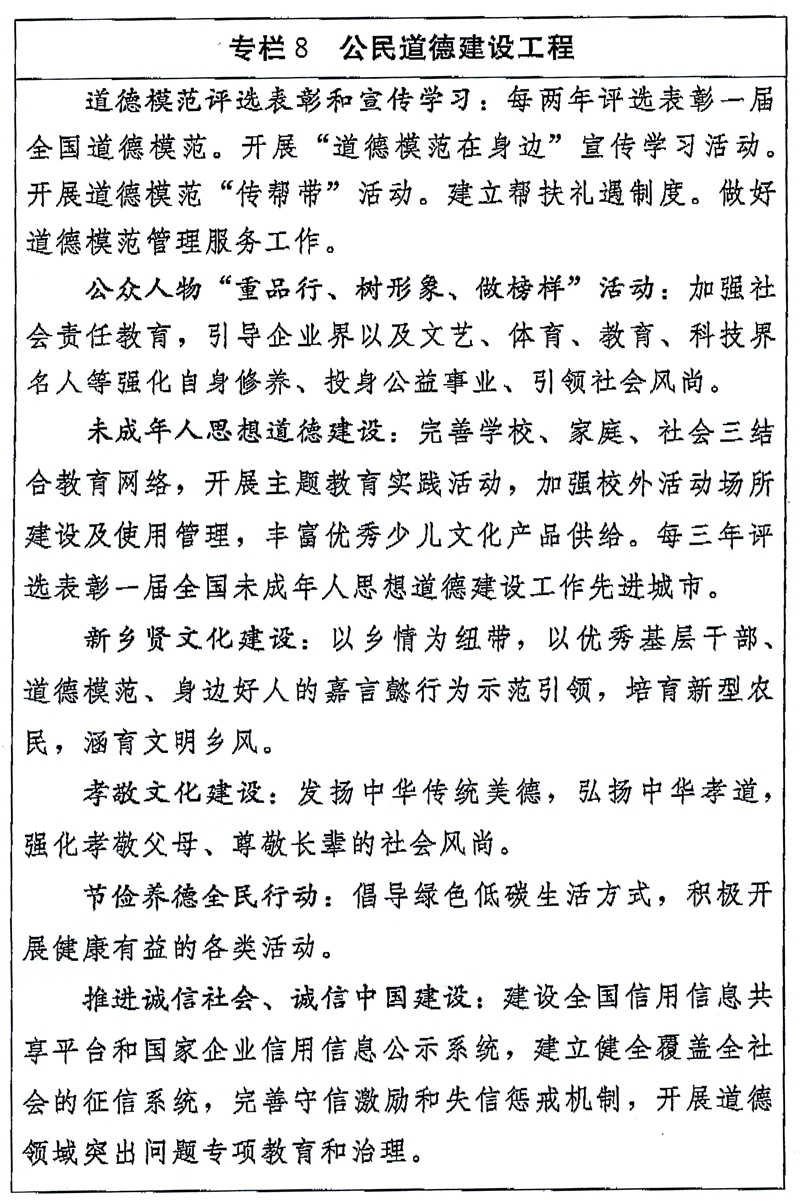 (三)深入推进公民道德建设。加强社会公德、职业道德、家庭美德、个人品德教育。发挥党员干部的模范带头作用。举办中国公民道德论坛。礼敬英雄人物,加强对全国重大典型和道德模范、时代楷模的学习宣传,广泛推出“最美人物”、善行义举和身边好人。建立健全先进模范发挥作用的长效机制。弘扬中华传统美德,创新发展乡贤文化,开展孝敬教育、勤劳节俭教育、文明礼仪教育。加强社会诚信建设,推进诚信建设制度化。弘扬劳动最光荣、劳动者最伟大的观念,加强企业文化建设,培育创新创业精神。