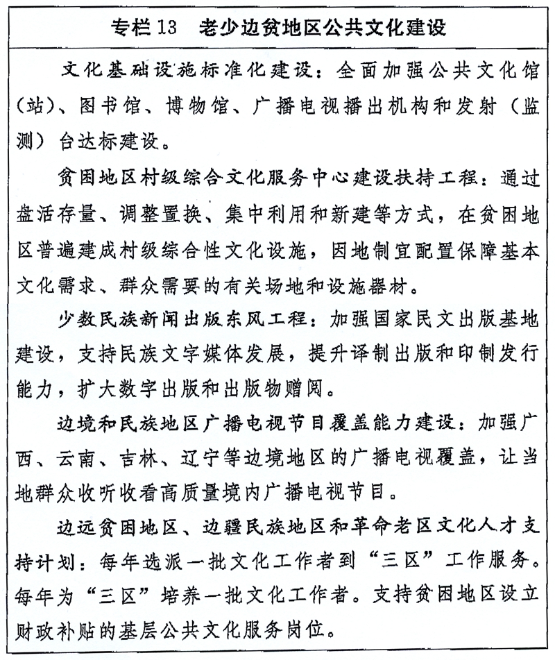 (四)推动老少边贫地区公共文化跨越发展。与国家脱贫攻坚战略相结合,实施一批公共文化设施建设项目。加强少数民族语言频率频道和涉农节目建设。为贫困地区配备或更新多功能流动文化服务车。支持少数民族电影事业发展。加大文化扶贫力度,建立健全“结对子、种文化”工作机制。