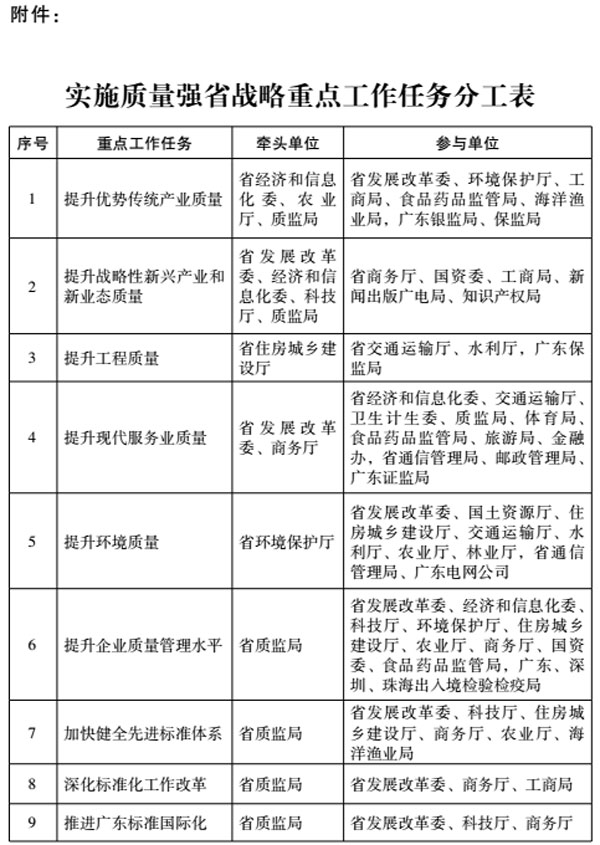 各地级以上市人民政府,顺德区人民政府,省政府各部门、各直属机构: 为深入贯彻落实《中共广东省委广东省人民政府关于实施质量强省战略的决定》(粤发〔2016〕9号),推动我省供给侧结构性改革和创新驱动发展,提升发展质量和效益,经省人民政府同意,现就进一步做好有关质量强省战略实施工作通知如下: 一、加强组织协调。省质量强省工作领导小组办公室(以下简称省质量强省办)要加强对粤发〔2016〕9号文贯彻落实工作的统筹协调,建立完善各部门相互支持、密切协作、运转顺畅的工作机制。各地要切实加强组织领导,根据本地区工作实际,制定实施方案和具体行动计划。省直牵头部门要按照本通知明确的重点任务分工(详见附表),会同参与单位抓紧制定牵头任务的实施方案。实施方案、行动计划及组织实施情况于2016年12月15日前报送省质量强省办,由该办汇总起草贯彻落实粤发〔2016〕9号文的情况报告,于12月底前上报省委、省政府。 二、加强政策扶持。各地、各有关部门要围绕建设质量强省,抓紧完善相关产业、环境、科技、金融、财政、人才培养等政策措施,为质量宏观管理、质量安全监管及标准、品牌、检验检测与量传溯源公共服务平台建设等提供必要保障。同时要进一步加大对粤东西北地区质量发展的政策扶持力度。相关政策措施制订及实施情况于12月15日前一并报送省质量强省办。 三、完善考核评价。省质量强省办要深入组织开展地级以上市政府质量工作考核,完善考核指标体系,改进考核方式方法,充分发挥工程质量、服务质量、环境质量工作有关牵头部门的积极性。指导地市政府组织开展对县(区)政府的质量工作考核,合理利用已有统计数据,减轻基层政府工作负担。要对各责任单位贯彻粤发〔2016〕9号文情况,认真组织开展年度评价、专项评价及第三方评价,加强督查督导和考评通报,确保各项工作落到实处。