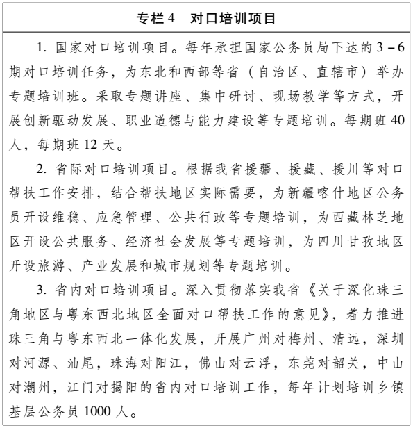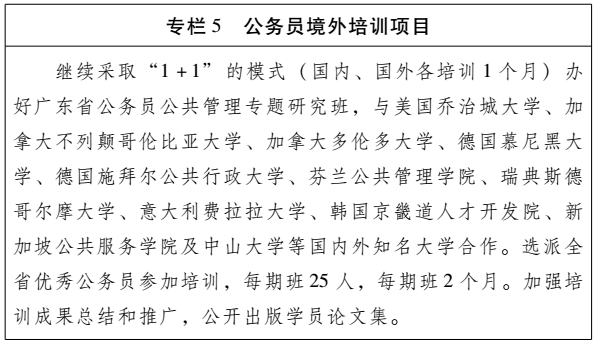 (五)发挥境外培训作用,打造高素质公务员队伍。科学谋划推进公务员境外培训工作,加强与欧美等发达国家和港澳地区有关机构合作,进一步拓宽公务员境外培训渠道,科学设置培训项目和课程。继续做好我省与欧美等发达国家著名高校合作举办境外培训班相关工作,培养一批具有世界眼光、战略思维的高素质公共管理人才。开设港澳地区交流培训班,通过加强与港澳特区政府部门的交流学习,为深化粤港澳合作提供人才保障和智力支持。