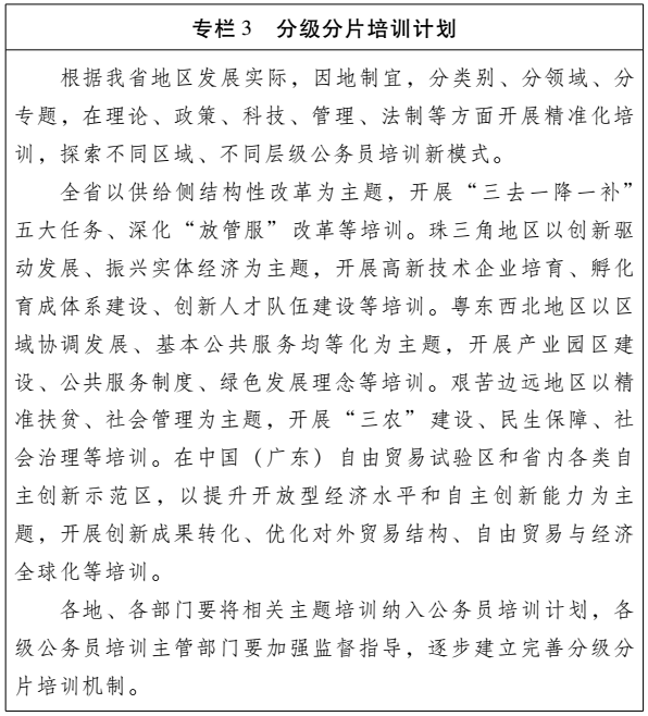 (五)改革创新能力。坚持将公务员教育培训与我省全面深化改革实践紧密结合,深入学习“三个定位、两个率先”目标内涵和要求,围绕国资国企、产权保护、价格财税金融、对外开放、养老保险等五大关键领域改革遇到的问题,深入开展简政放权、放管结合、优化服务等内容培训,培养各级公务员改革创新思维和攻坚意识,丰富政策知识储备,提高改革创新能力和推进经济社会和谐发展的能力。 (六)专门业务培训。坚持干什么学什么,缺什么补什么,抓好履职基本功训练,有针对性地开展岗位必备知识培训,加强与业务工作密切相关的各种新理论、新知识、新技能的培训,切实提高公务员的专业素养和履职能力。 三、主要任务和措施 (一)加强制度建设,提高管理水平。健全以需求为导向的培训计划生成机制,将需求调研作为编制培训计划的必要环节。落实和完善办学质量评估办法和指标体系,坚持定量与定性、激励与约束相结合,定期开展教学和管理评估。建立评估档案管理和评估反馈机制,把评估结果作为安排培训机构承担培训任务的重要依据。强化行政机关公务员培训激励约束机制,实现培训与考核、任职、晋升等环节紧密结合。健全培训档案,如实记录参加培训情况和考核结果。将参加脱产培训情况记入公务员年度考核登记表,参加2个月以上脱产培训情况记入干部任免审批表。 (二)分级分片指导,服务中心工作。围绕省委、省政府中心工作,针对不同层级、不同地区公务员工作实际需求,分片指导、分级负责,加快建设“层级清晰、地域协同、主题鲜明”的公务员培训体系。在全省范围内以供给侧结构性改革为主题,重点以推进产业结构调整、构建创新型经济格局为内容开展培训;在珠三角地区以创新驱动发展为主题,重点以转换发展动能、推动制造业与服务业协同发展为内容开展培训;在粤东西北地区以区域协调发展、基本公共服务均等化为主题,重点以推动产业园区提质增效、加强生态保护为内容开展培训。