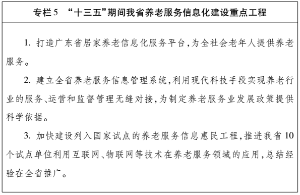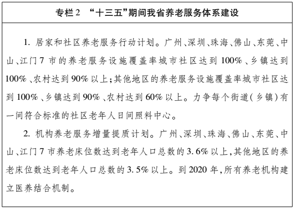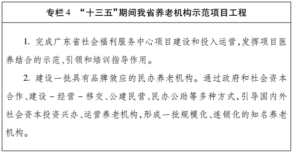 18.丰富养老服务业态。大力发展养老服务企业,加快形成养老服务产业集群。支持养老服务产业与健康、养生、旅游、文化、健身、休闲等产业融合发展,开发养老服务项目,丰富养老服务产业新模式、新业态,将养老服务业培育成为我省新的经济增长点。鼓励和支持金融、地产、互联网等企业进入养老服务产业。(省发展改革委牵头,省经济和信息化委、省科技厅、省民政厅、省财政厅、省商务厅、省卫生计生委、省体育局、省旅游局、广东银监局参加)