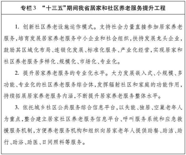 7.大力发展居家社区养老服务。逐步建立支持家庭养老的政策体系,支持成年子女与老年父母共同生活,履行赡养义务和承担照料责任。以满足老年人服务需求为导向,创新服务模式,提升质量效能,引导社区日间照料中心等养老服务机构依托社区综合服务设施和社区公共服务综合信息平台,以日间托管和上门服务为主要方式,以生活照料、家政服务、精神慰藉、护理保健、辅具配置、紧急救援等为主要服务内容,为老年人提供精准化、个性化、专业化服务。支持城乡社区开展邻里间互帮互助、结伴助老等活动,建立由亲属、邻里、社区、单位共同参加的志愿者队伍,定期上门巡访独居、空巢老年人家庭,帮助老年人解决实际困难。(省民政厅牵头,省公安厅、省财政厅、省人力资源社会保障厅、省商务厅、省卫生计生委参加)