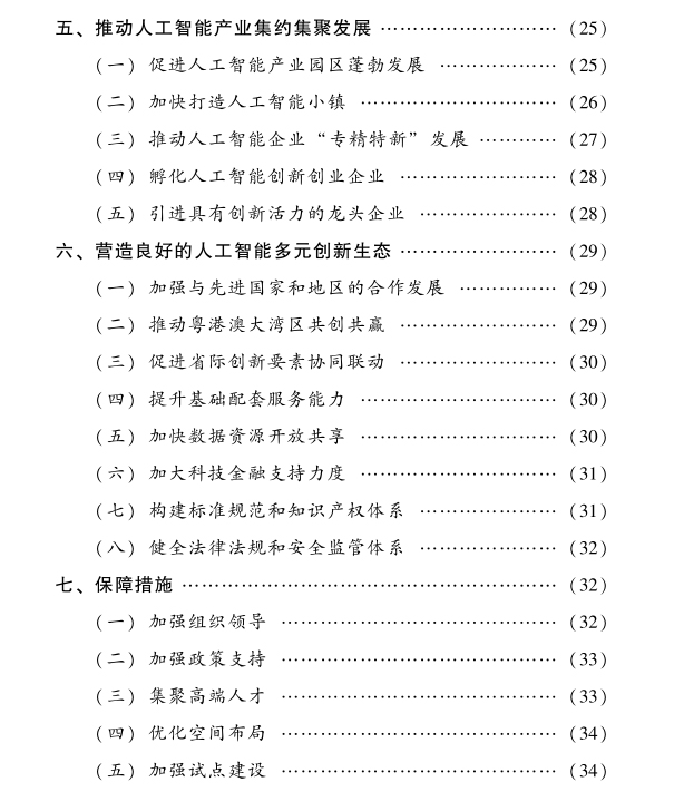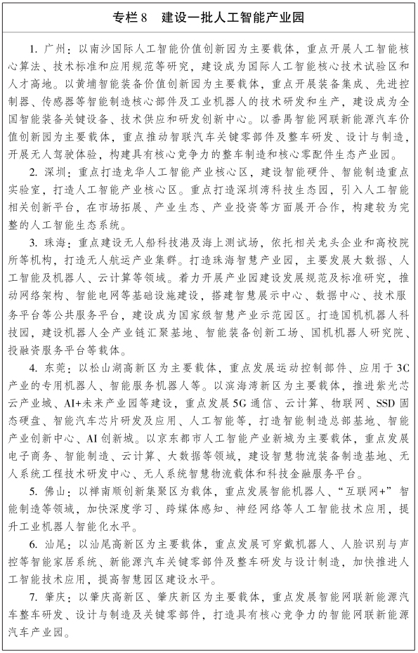 (一)促进人工智能产业园区蓬勃发展。选择人工智能产业发展基础较好、比较优势明显的地市,培育建设一批人工智能产业园区。广州重点建设南沙国际人工智能价值创新园、黄埔智能装备价值创新园、番禺智能网联新能源汽车价值创新园。深圳重点建设龙华人工智能产业核心区、深圳湾科技生态园。珠海重点建设无人船科技港及海上测试场、珠海智慧产业园、国机机器人科技园。东莞重点建设松山湖高新区、滨海湾新区、京东都市人工智能产业新城。佛山重点建设禅南顺创新集聚区。汕尾重点建设汕尾高新区。肇庆重点建设肇庆高新区、肇庆新区。