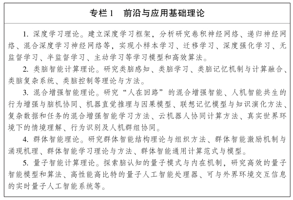 (一)加强前沿与应用基础理论研究。积极推进深度学习理论研究,在高性能计算架构、遗传算法、神经网络等核心理论及算法领域深入研发,在小样本学习、迁移学习、新型计算架构等前沿理论及技术领域实现突破。集中优势资源和力量,深入推进类脑智能计算理论研究,重点突破类脑的信息编码、处理、记忆、学习与推理理论,构建大规模类脑智能计算的新模型和脑启发的认知计算模型。瞄准世界先进水平,积极推动混合增强智能理论发展,重点突破人机协同共融的情境理解与决策学习、行为识别与认知交互、直觉推理与因果模型、记忆与知识演化等理论。加强群体智能理论研究,重点突破群体智能的组织、涌现、学习的理论与方法,建立可表达、可计算的群智激励算法和模型。狠抓发展机遇,前瞻布局量子智能计算理论研究,重点突破量子加速的机器学习方法,建立高性能计算与量子算法混合模型。加强规划引导,大力支持跨学科探索研究,推动与神经科学、认知科学、量子科学等相关基础学科的交叉融合,形成对人工智能理论的强大支撑。