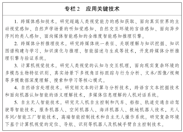 (二)着力突破应用关键技术瓶颈。加大跨媒体感知、跨媒体分析推理、计算机视觉、自然语言处理等领域的投入力度,形成一批重大科技成果。跨媒体感知技术重点突破低成本低能耗智能感知、复杂场景主动感知、自然环境听觉与言语感知、多媒体自主学习等技术方法,实现超人感知和高动态、高维度、多模式分布式大场景感知。着力推进跨媒体分析推理技术发展,重点突破跨媒体统一表征、关联理解与知识挖掘等技术,实现跨媒体知识表征、分析、挖掘、推理、演化和利用。计算机视觉技术重点在图像处理、模式识别、图像理解、视频处理、视频理解、视频摘要生成、三维视觉等核心领域实现技术突破,提高科研转化率,重视底层技术研发,积极建立开源代码生态体系。自然语言处理技术重点推进深层语义理解、逻辑推理决策、知识图谱、自然语言对话等关键技术研发,强化结合多种语境信息的语用计算研究,提高在真实应用场景、噪声和口音情况下的语音交互可靠性、鲁棒性和适应性。大力促进自主无人智能技术攻关,重点突破自主无人系统计算架构、复杂动态场景感知与理解、实时精准定位、面向复杂环境的适应性智能导航等共性技术。