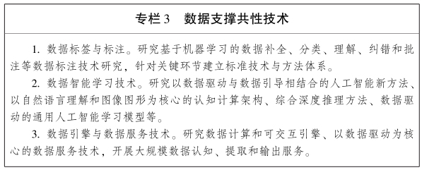 (三)着重加强数据支撑共性技术攻关。充分利用政务、医疗、制造等领域数据信息,面向优势产业和通用应用场景,积极开展数据标签与标注标准化技术攻关,为机器理解、深度学习、人机交互等提供有效且高质量的数据支撑。重点突破数据智能学习技术的无监督学习、综合深度推理等,建立以数据驱动为核心的认知计算模型。积极发展数据引擎与数据服务技术,重点突破数据深度搜索、数据深度加工和数据交互核心技术,实现多场景下对数据专业化需求的智能提取和输出。